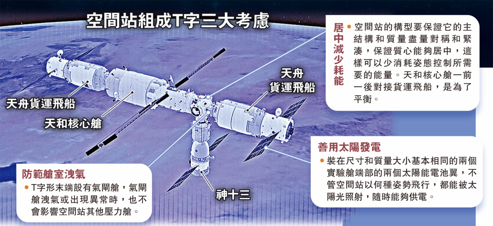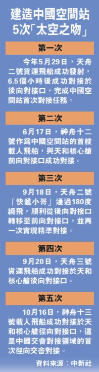 (大公報記者 劉凝哲)16日,中國空間站再迎三人組。神舟十三號載人飛船16日經過約6.5小時,於當日6時56分,採用自主快速交會對接模式「垂直穿針」,成功對接於天和核心艙徑向端口,完美首秀「太空華爾茲」,與此前已對接的天舟二號、天舟三號貨運飛船一起構成四艙(船)組合體,始於今年5月29日的「太空之吻」五連捷,4個航天器形成「T字」組合體。9時58分,「神十三」航天員翟志剛、王亞平、葉光富先後進入天和核心艙,後續他們將完成更多科研任務,中國空間站開啟有人長期駐留時代。