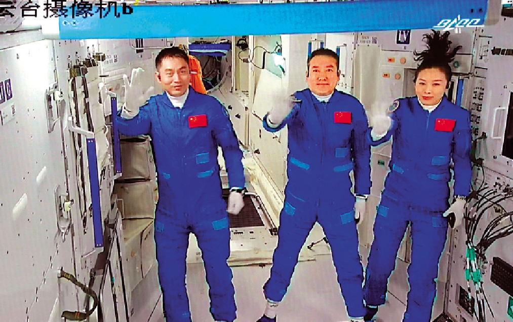 「神舟十三號已進入我們的太空家園──天和核心艙」,神舟十三號乘組指令長翟志剛率先從空間站中報平安。「後續,我們一定團結協作、精心操作,圓滿完成各項任務,努力探索浩瀚宇宙」,「亞平老師」隨後說。她是進入中國空間站的首位女性,也將成為首位在太空出艙的中國女航天員。空間站中的微重力環境讓她的辮子「飛」了起來,又漂亮又有趣。「感謝大家對神舟十三號乘組的支持和關愛,我們一定不負厚望,請黨和人民放心!」首次執行飛行任務也是最年輕的「80後」航天員葉光富也精神抖擻地向地面報告。