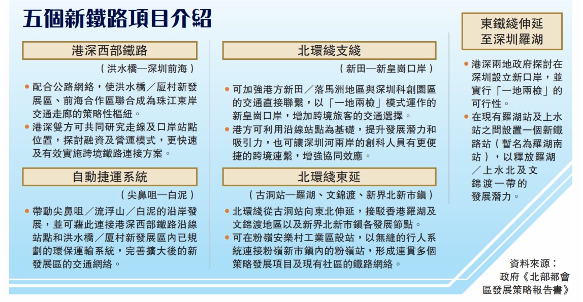五個新鐵路項目包括港深西部鐵路、北環綫支綫、東鐵綫北延、北環綫東延、連接尖鼻咀及白泥的自動捷運系統(見附表)。陳帆昨日發表網誌表示,建立更完善的跨境設施及交通網絡,可進一步縮短跨境通勤時間,港深一小時通勤網絡的動態範圍亦會逐步擴大,有助本港居民把握大灣區發展和《全面深化前海深港現代服務業合作區改革開放方案》帶來的機遇。