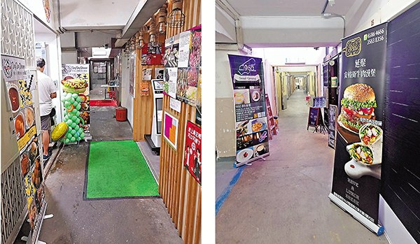 香港文匯報記者昨日在觀塘成業街多幢工廠大廈訪察,發現不同工廈內均有不少食肆營業,包括火鍋店、泰菜食肆、甜品店、私房菜等,其中在一層便最少有5間食肆在營運中,而在這些食肆的同層卻有機器工程公司,加上這些工廈的樓上均有不少劏房及派對房,安全情況實在令人擔心。不少食肆更將宣傳牌或雜物擺放在通道,容易造成阻塞,一旦發生火警將影響人群逃生。
