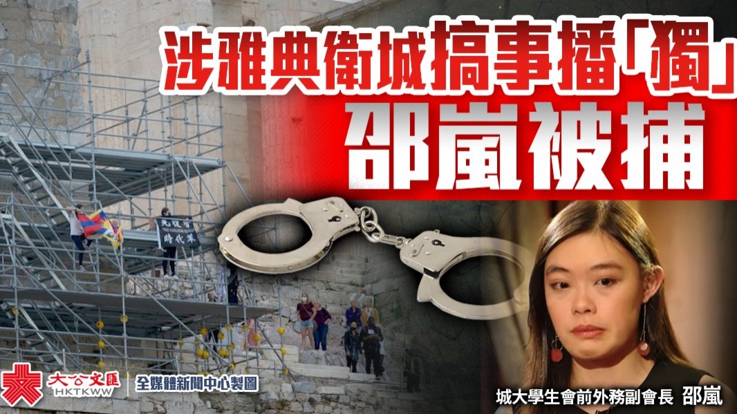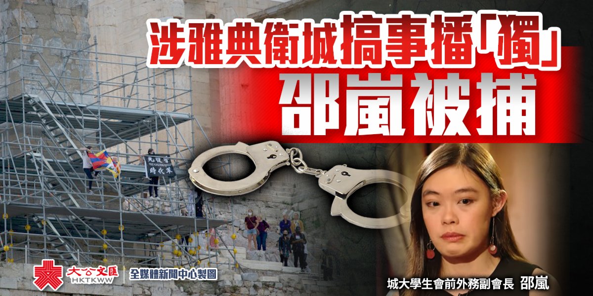 大公文匯全媒體援引美聯社報道,「獨人」、城大學生會前外務副會長邵嵐,在希臘雅典衛城試圖掛起「光時」旗,被希臘警方拘捕。