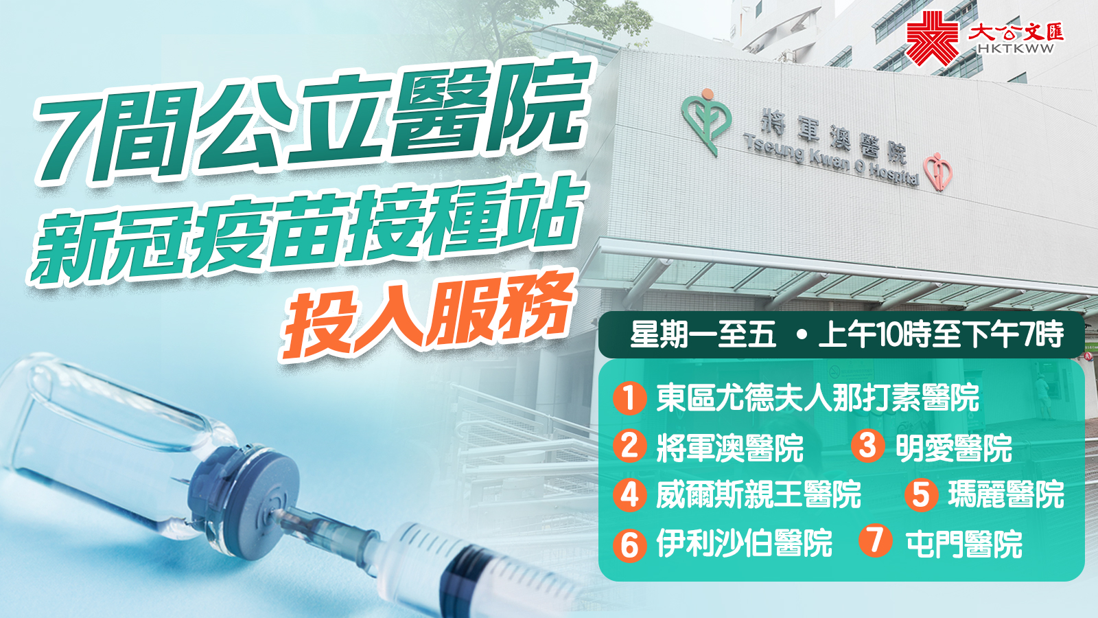 大公文匯全媒體報道,東區尤德夫人那打素醫院、將軍澳醫院、明愛醫院和威爾斯親王醫院增設的新冠疫苗接種站今日(18日)起投入服務。連同上月啓用的瑪麗醫院、伊利沙伯醫院和屯門醫院接種站,本港現共有7個醫院接種站服務市民。7間公立醫院的新冠疫苗接種站的開放時間為星期一至五(公眾假期除外)上午10時至下午7時,午膳時間照常開放,最後接種時間為下午6時30分。