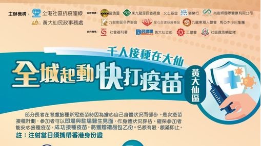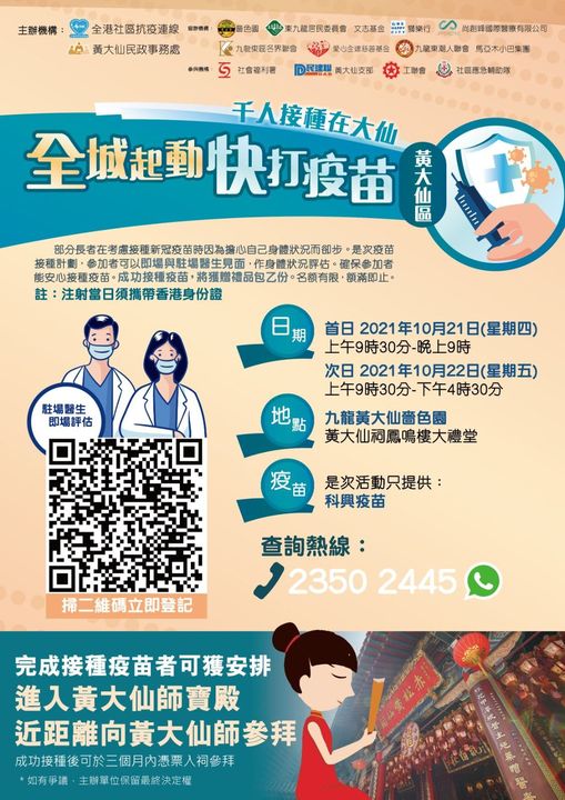 為推動全城「谷針」,全港社區抗疫連線、黃大仙民政處及多個地區團體舉辦「千人接種在大仙」活動,參與即場接種的市民可獲發入場券,進入黃大仙祠大殿內(平時不對外開放),近距離向黃大仙師參拜,機會難得。
