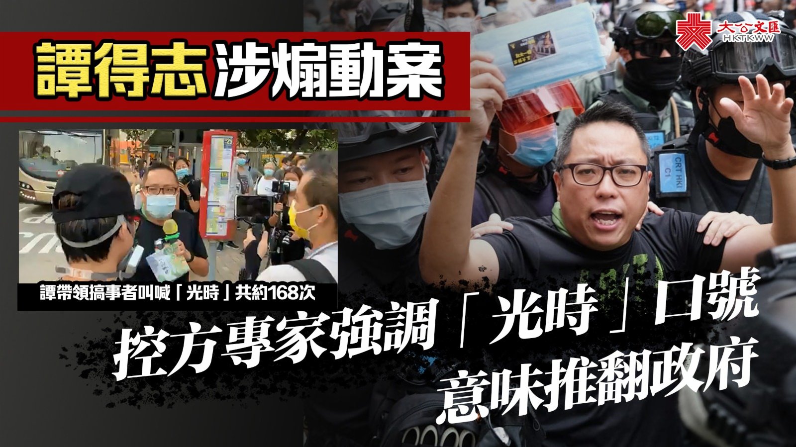 大公文匯全媒體報道,「攬炒」派人民力量副主席譚得志「快必」去年涉嫌多次在街站叫喊「光時」等口號,被控發表煽動文字等共14罪。案件今日(18日)在區域法院續審,嶺南大學歷史系教授劉智鵬作供,再次以歷史角度解釋「光時」口號的起源及演變。劉重申,口號有認為「香港不屬於中國」及「推翻政府並取而代之」的意思。