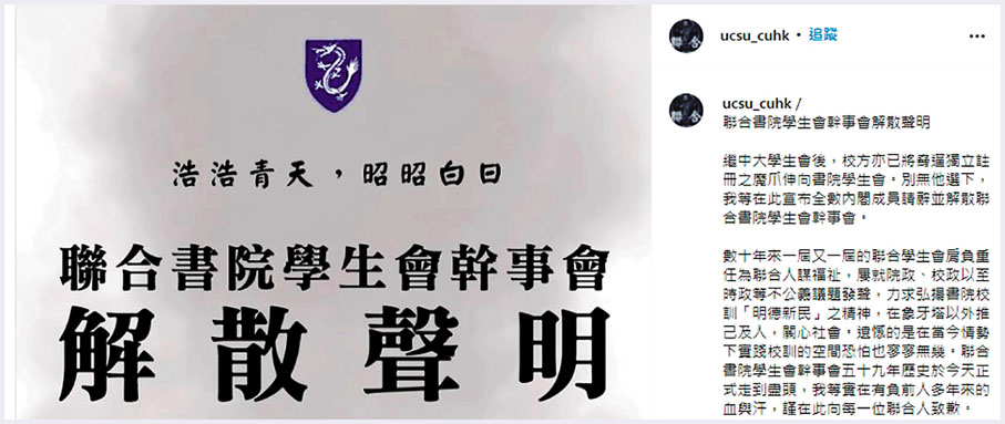 (香港文匯報記者 姬文風)因應中大學生會屢屢發表可能違法的言論,經勸喻及提醒仍不澄清,校方今年2月決定與學生會全面割席,包括要求該會註冊為獨立社團或公司,自行承擔法律責任。不過,學生會拒絕責任自負,本月初宣布因此解散,而校內的聯合書院學生會幹事會昨亦「照辦煮碗」,宣布全數內閣成員請辭並解散,但在聲明中仍抵賴稱是「校方脅逼獨立註冊」云云,諉過校方。有網民反問校方做法何來「逼使」學生組織自行解散,質疑實情不過是有人要找下台階「畏罪潛逃」。