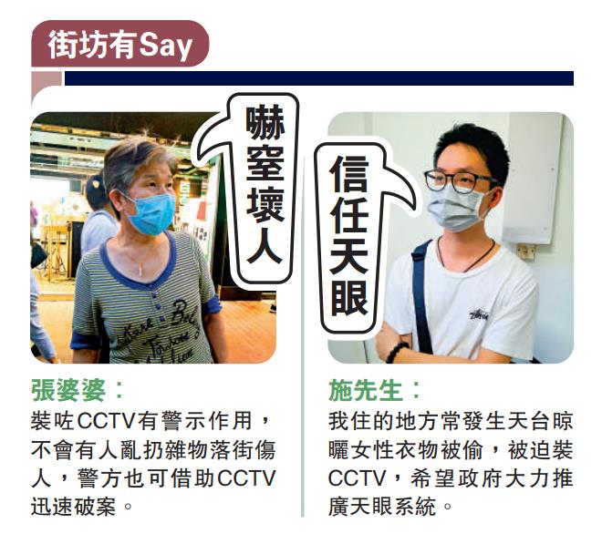 住在西洋菜南街一幢唐樓的施先生,贊成多安裝天眼,認為可震懾犯罪,對維持治安作用巨大。他表示,住所大廈經常有竊案,天台更不時發生變態佬偷內衣褲事件,為防偷盜,他也安裝了閉路電視。施先生說,過往曾在內地生活,自從廣泛安裝人工智能天眼系統後,社會治安明顯好轉,「而家內地比香港的治安還好」。