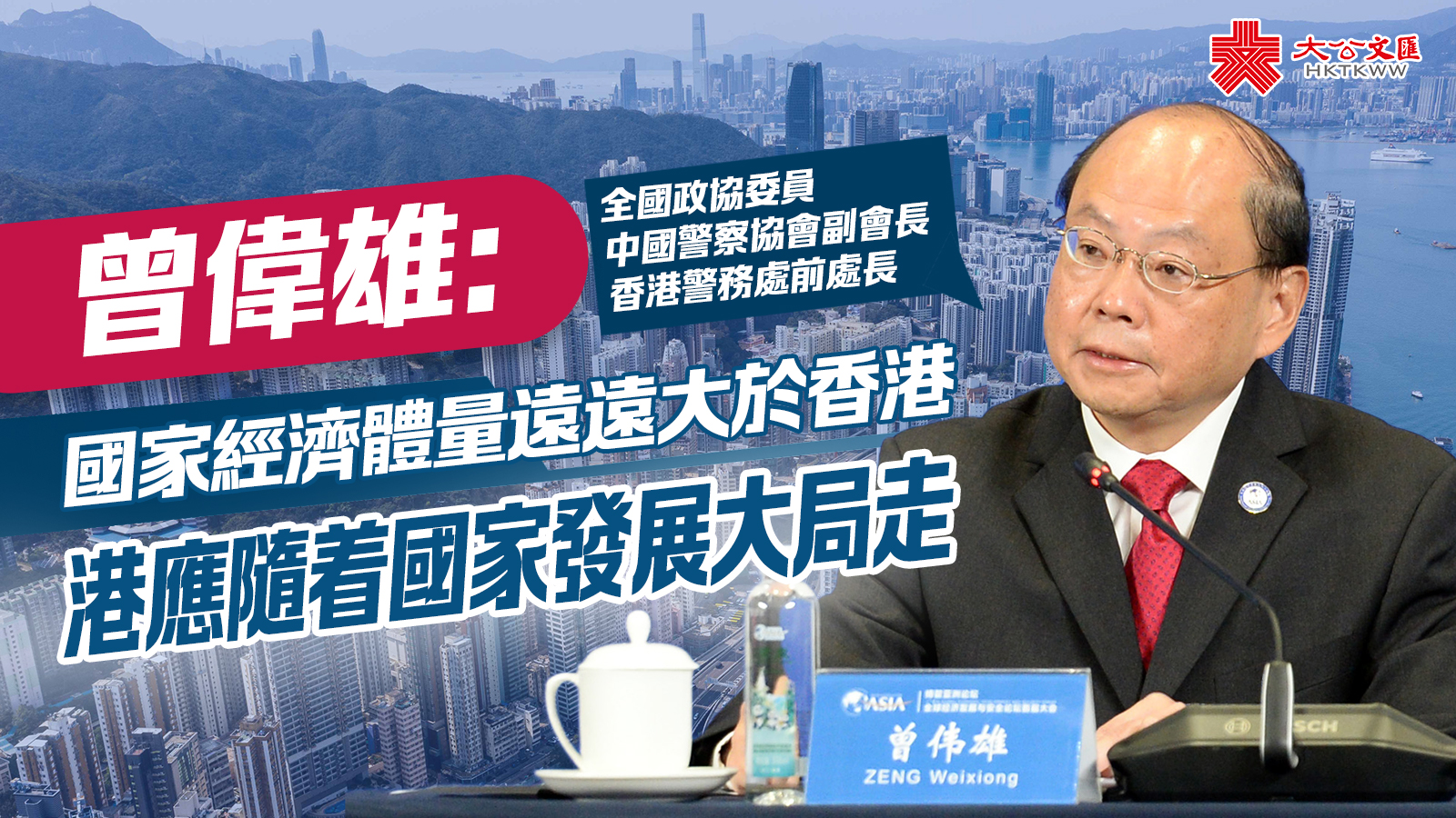 曾偉雄說,國家的經濟體量遠遠大於香港,這種體量加上當前發展方向,將轉化為一種非常大的動力。在此發展大潮中,香港作為一個特區,不僅從政治倫理上應該隨着國家發展大局走,從實際經濟需要上也必須這樣做。