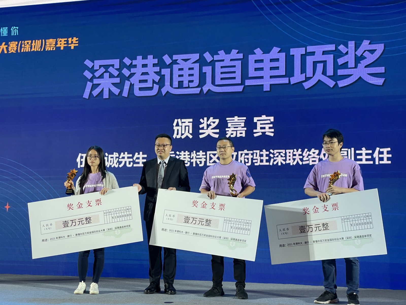 (大公文匯 記者胡永愛、通訊員譚笑)10月19日,港科大-建行·惠懂你百萬獎金國際創業大賽(深圳)嘉年華在深圳舉行。歷時半年多的創業大賽落幕,晉級決賽的九強團隊通過創新集市、電梯演說車輪戰、賽點戰-商業情景模擬等環節進行全方位比拚。升暘光學、若谷、尚維高科三支創業團隊分獲冠、亞、季軍。其中尚維高科是港青創業團隊,其獲獎項目是20分鐘快速檢驗核酸。