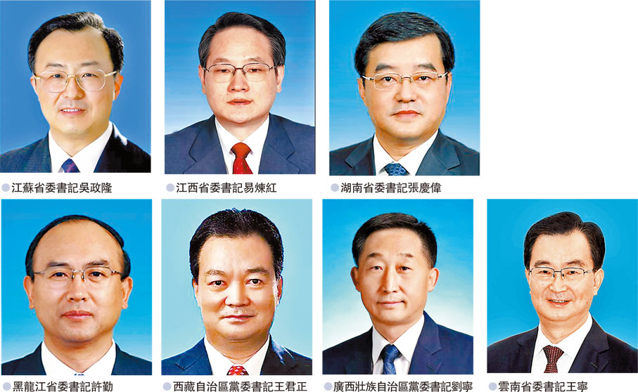 (香港文匯報記者 王玨)地方黨委換屆啟幕前夕,中央調整七省(區)黨委一把手。其中,江蘇省省長吳政隆、江西省省長易煉紅順位接任省委書記,黑龍江省委書記張慶偉調任湖南省委書記,其職缺由河北省省長許勤接任,新疆維吾爾自治區黨委副書記、兵團黨委書記、政委王君正任西藏自治區黨委書記,遼寧省省長劉寧南下任廣西壯族自治區黨委書記,福建省省長王寧履新雲南省委書記。除易煉紅外,其餘六位獲任新職的書記均為60後,七人都有充足地方任職經歷,有的具備中央和地方交流背景,皆年富力強,治理經驗豐富。同時,婁勤儉、劉奇、許達哲、吳英傑、鹿心社、阮成發不再擔任江蘇、江西、湖南、西藏、廣西、雲南黨委書記。六人均年滿64歲或65歲。