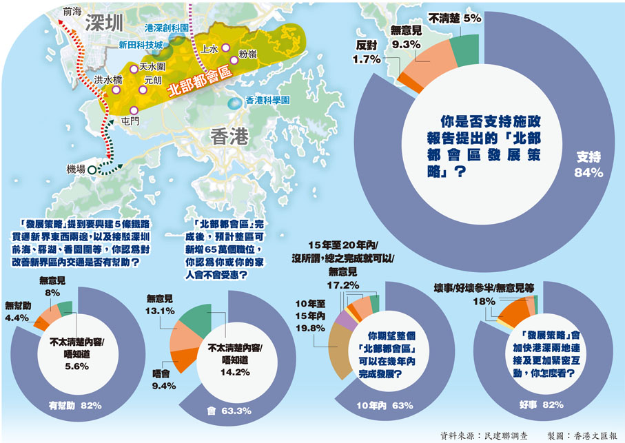昨日公布的調查結果顯示,84%受訪者支持「北部都會區發展策略」,82%受訪者認同興建多條鐵路貫通新界東西兩邊,以及接駁深圳前海、羅湖、香園圍等對改善新界區內交通有幫助,63%受訪者認為,自己或家人將受惠於「北部都會區」發展完成後新增的65萬職位。