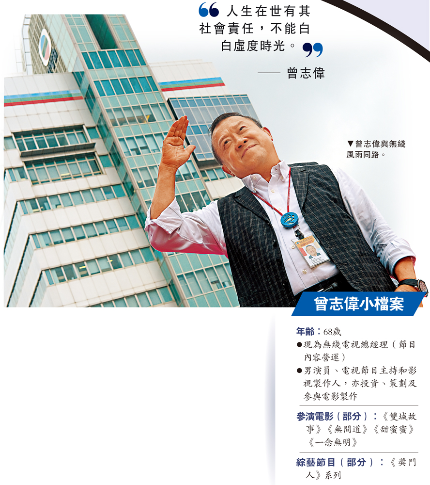 已年過退休之齡,但曾志偉仍接受無綫主席許濤之邀,回巢擔任高層,主要原因是希望將自己從事多年影視以及在內地的經驗,帶入無綫跟大家分享。「過去十幾年影業不景氣,出現人才斷層,難以栽培接班人。但我唔會放棄,人才唔係無,而是要有人提攜。我個人的才華和累積的經驗,只有與年輕人分享,由他們去創作,方可繼續發光發熱。當他們能夠接棒我就退下來,我也未必可以如邵逸夫做到90歲,我做人識得放下。」