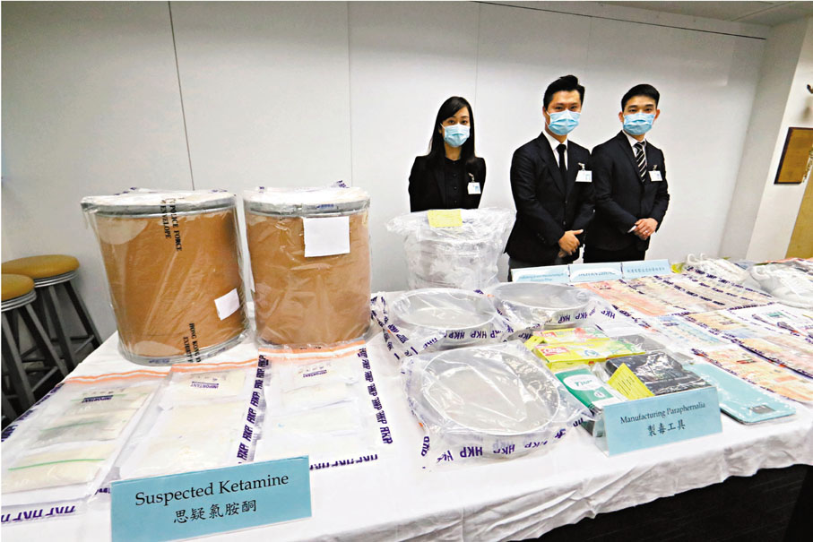 【香港文匯報記者 蕭景源】警方搗破利用中學生販毒的犯罪集團,檢獲53公斤懷疑氯胺酮(俗稱K仔)毒品,市值約3,869萬元。警方上周五在灣仔一間茶餐廳截查3名中學生,他們剛接收一個空運來港的「毒郵包」,內有逾百萬元毒品,於是拘捕3人,其後再順藤摸瓜追查幕後操控者,前日掩至九龍灣啟晴邨一單位內搗破毒品包裝工場,再拘捕販毒集團4人,相信他們利用青少年「搵快錢」心態,利誘他們代為接收空運來港的毒品郵包,並分拆毒品給買家。