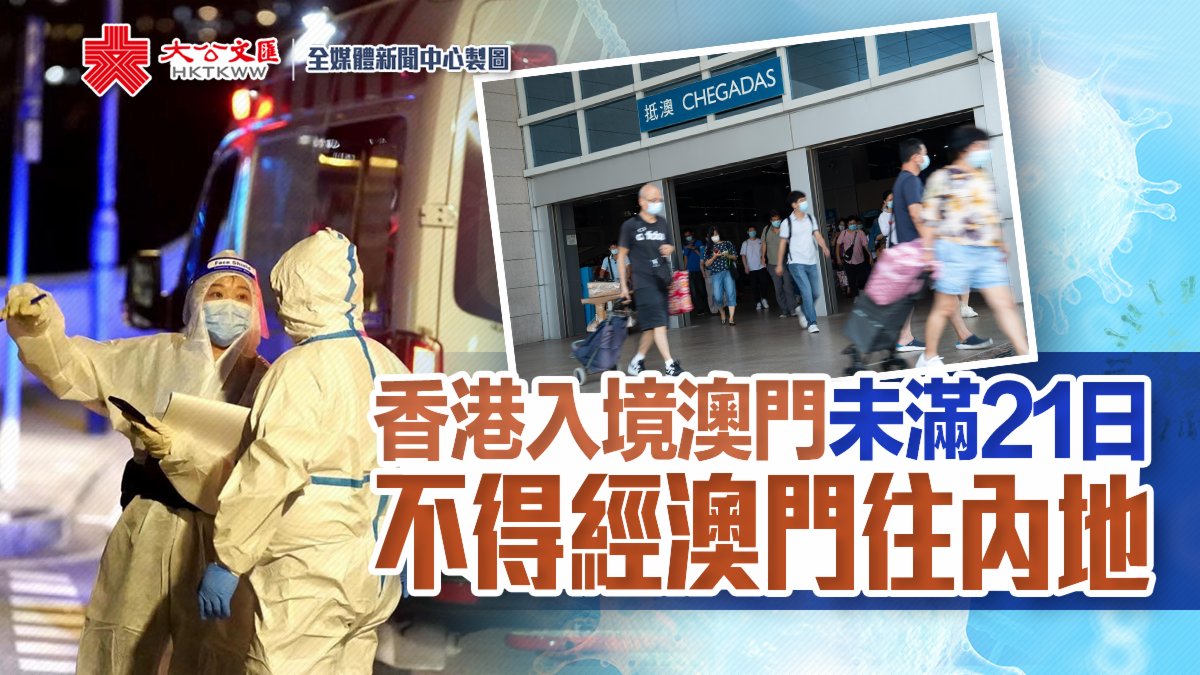 大公文匯全媒體報道,澳門政府今日(22日)表示,由明日(23日)零時起,因香港旅居史而於澳門隔離檢疫的人士,在完成14天檢疫後,7日內不得經澳門前往內地。至於完成檢疫後毋須7日自我健康管理的政策,則維持不變。