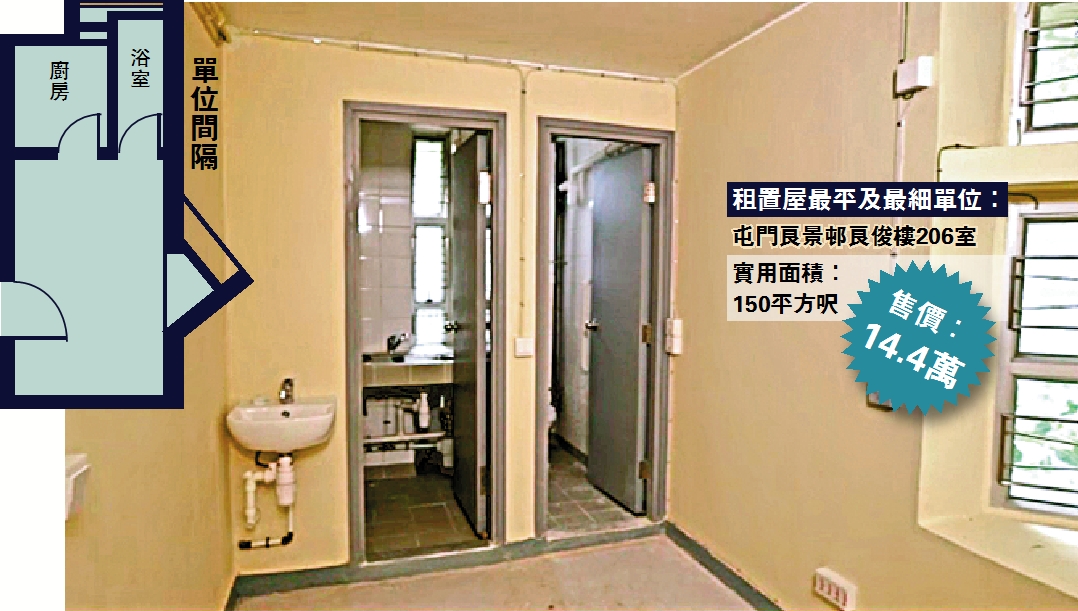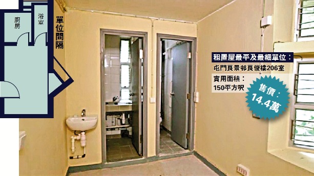 現時私人樓價高企,租置公屋貨尾以市價一、二折發售,只要早前入紙申請、攪珠時抽中,隨時只需幾十萬元即可晉升成為業主。今期租置貨尾單位中,最便宜單位是位於屯門良景邨良俊樓2樓06室的150平方呎單位,僅售14.4萬元,根據房委會網頁提供的單位視頻所見,單位沒有房間,窗台呈三角形,由於樓層較低,窗外望樹景,廁所也非常狹窄。