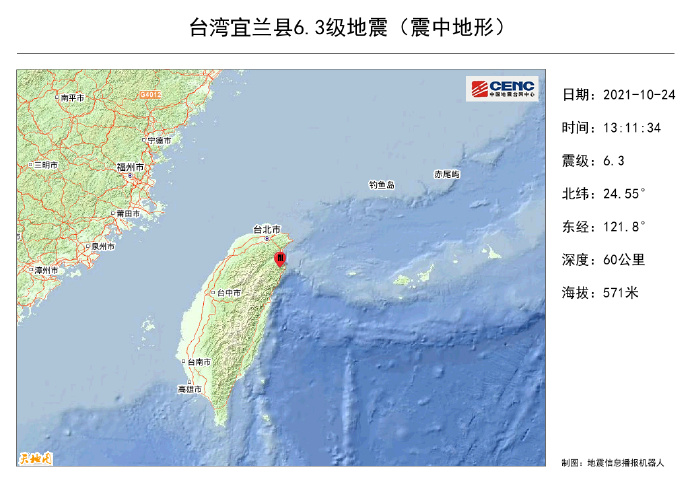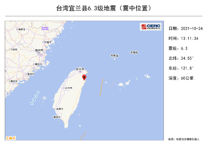另據中國地震台網中心網站消息,北京時間10月24日13時11分,台灣宜蘭縣發生6.3級地震,震中位於北緯24.55度、東經121.8度,震源深度60.0公里。地震造成台灣全島震感強烈,福建廈門、福州、泉州、莆田等地震感明顯。