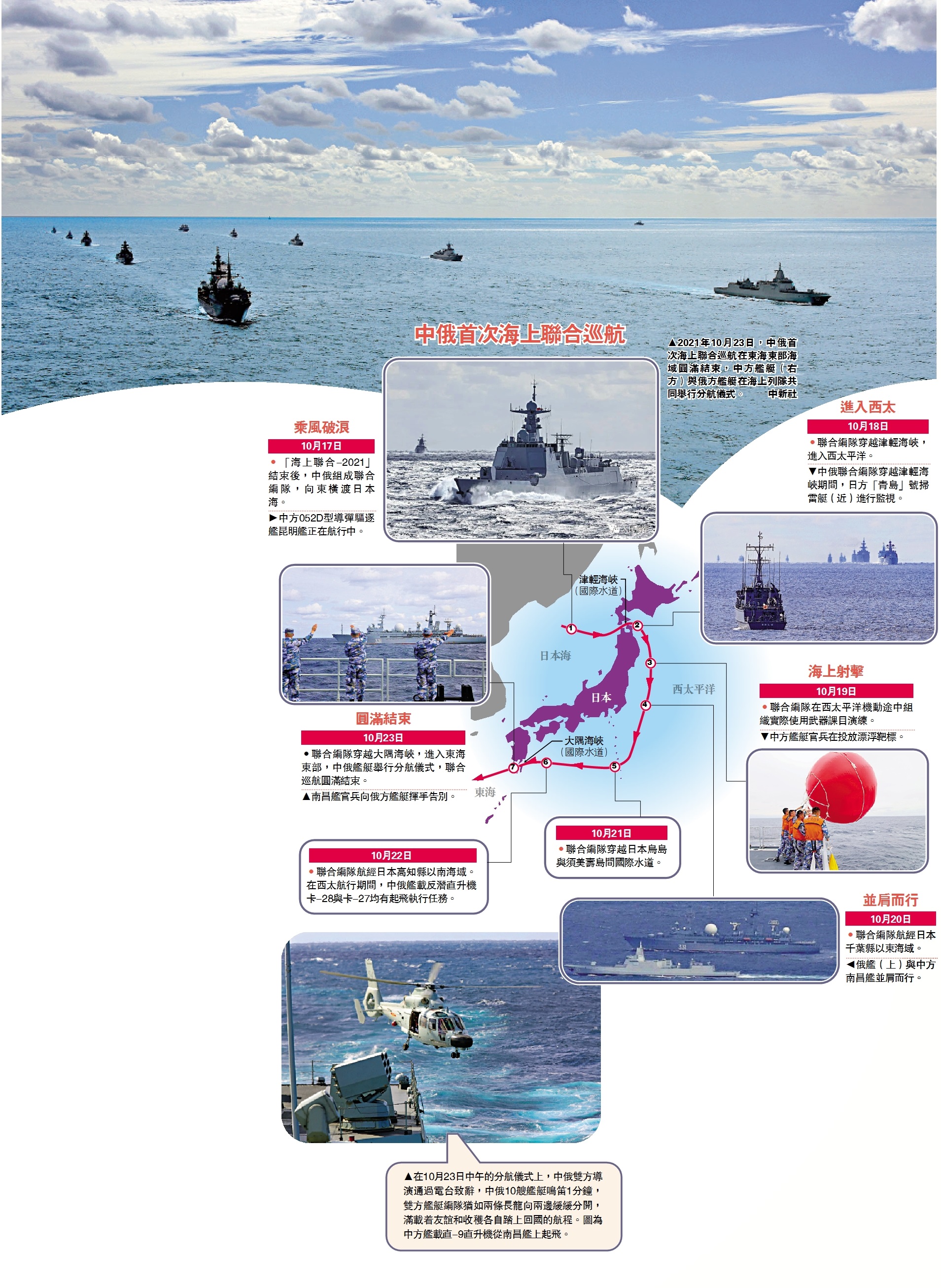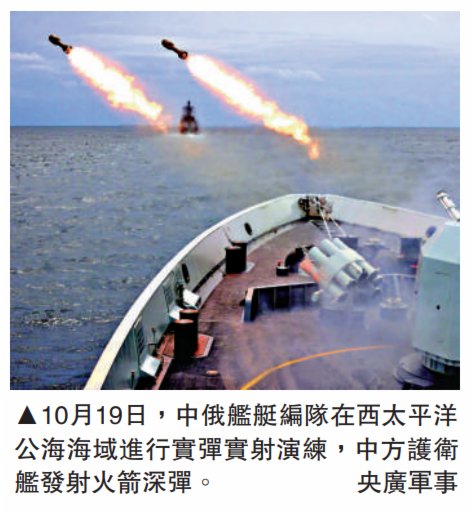 (大公報記者 馬浩亮)中俄兩國海軍首次海上聯合巡航10月17日至23日在日本海、西太平洋及東海海域成功舉行。其間,兩軍10艘艦艇、6架艦載直升機在解放軍055型萬噸大驅等主力艦的引領下,組織聯合航渡、聯合機動、實際使用武器等課目演練,並穿越了津輕海峽和大隅海峽等國際水道。聯合巡航在大風浪條件下進行,磨礪遠海惡劣海況環境作戰,錘煉多元戰法以及應對突發事件的能力,以實際行動回擊和震懾了近期美、日、澳、英等國在西太平洋及南海海域的挑釁行徑。