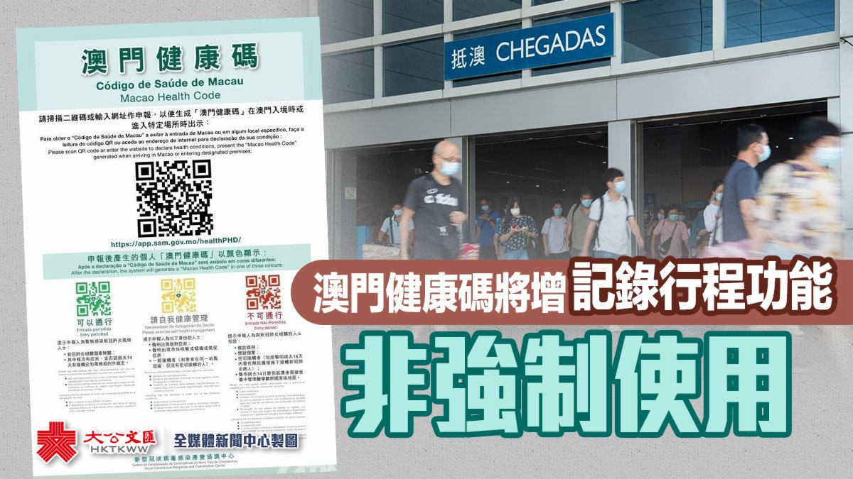 大公文匯全媒體報道,澳門衞生局計劃在澳門健康碼新增行程記錄功能,但並非強制使用。澳門衞生局傳染病防制暨疾病監測部協調員梁亦好今日(25日)在記者會上表示,現時行程記錄功能已處於後期測試階段,正爭取盡快推出。