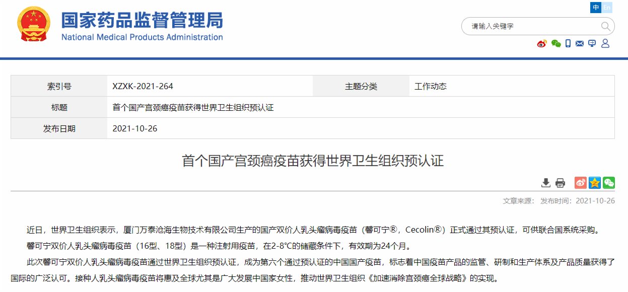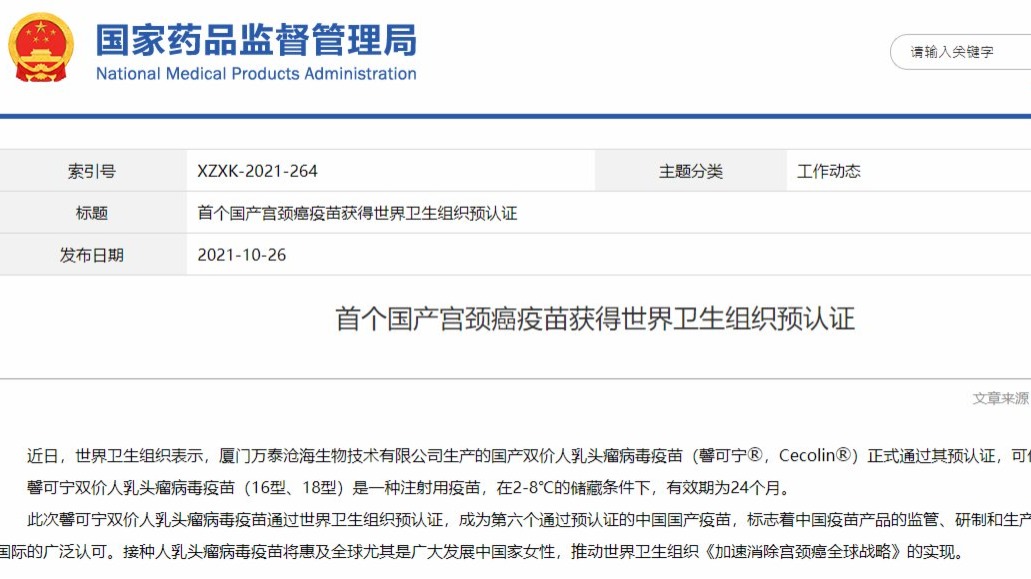 據國家藥品監督管理局網站今日(26日)消息,近日,世界衞生組織表示,廈門萬泰滄海生物技術有限公司生產的國產雙價人乳頭瘤病毒疫苗正式通過其預認證,可供聯合國系統採購。