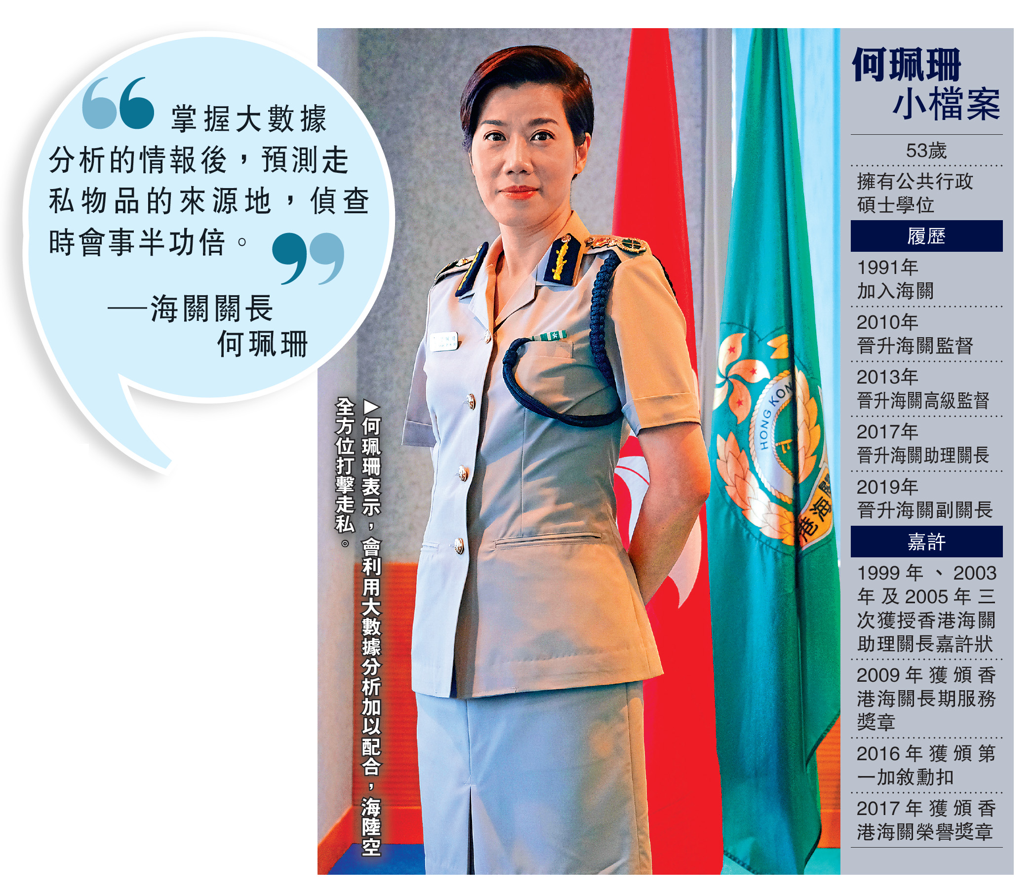 大公報記者 李雅雯、楊州(文) 文 澔(圖):香港首名女關長何珮珊,剛上任已為海關面對新時代新挑戰做好連串革新,在海關多元的工作範疇引入人工智能檢查系統、大數據罪案分析走私趨勢、數碼行政及企業管理、線上聊天機械人等,務求更精準打擊走私、堵截滲透危害國安「軟對抗」的物品流入、藉以保障生物安全、維護經濟安全、國土安全等國安體系的方方面面。
