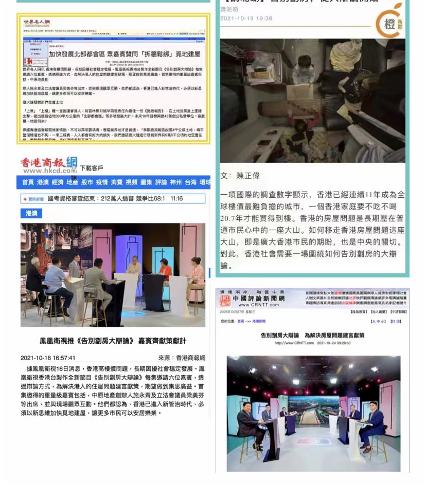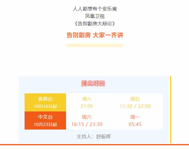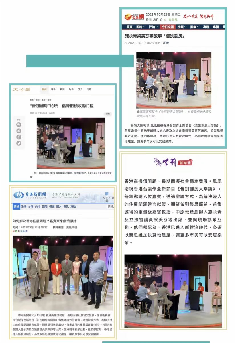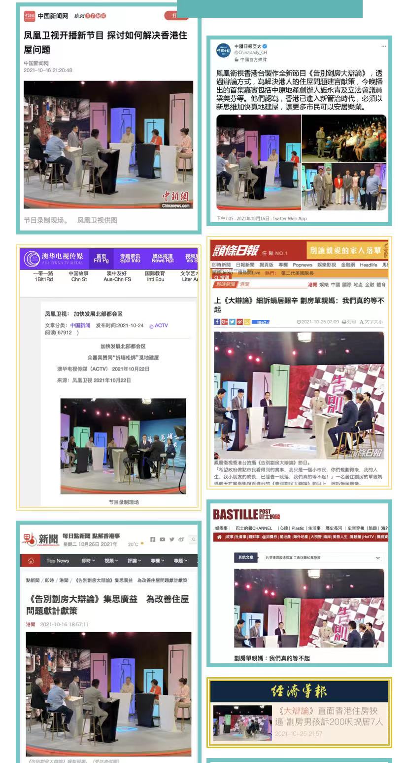 鳳凰衛視香港台製作全新節目《告別劏房大辯論》每集邀請六位嘉賓,透過辯論方式,為解決港人的住屋問題建言獻策。
