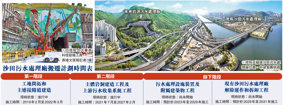 (香港文匯報記者 邵昕、黃恆諾、姜嘉軒)「時代精神耀香江之大國建造」民生工程走訪活動昨日進入第三天,香港文匯報記者跟隨傳媒團參觀由中國建築國際集團有限公司負責的兩項工程,其中「搬遷沙田污水處理廠往岩洞工程項目」正如火如荼進行中,目標在2029年讓新的處理廠投入運作,而舊廠拆除工程則預料於2031年完成,屆時將騰出28公頃優質臨海用地作其他有利民生的用途,以紓緩香港用地壓力,並將改善原處理廠設備老化及對環境造成的污染問題。整個項目施工過程中充分體現安全、科技、環保的理念,以創新科技保障施工安全,保護周邊環境。