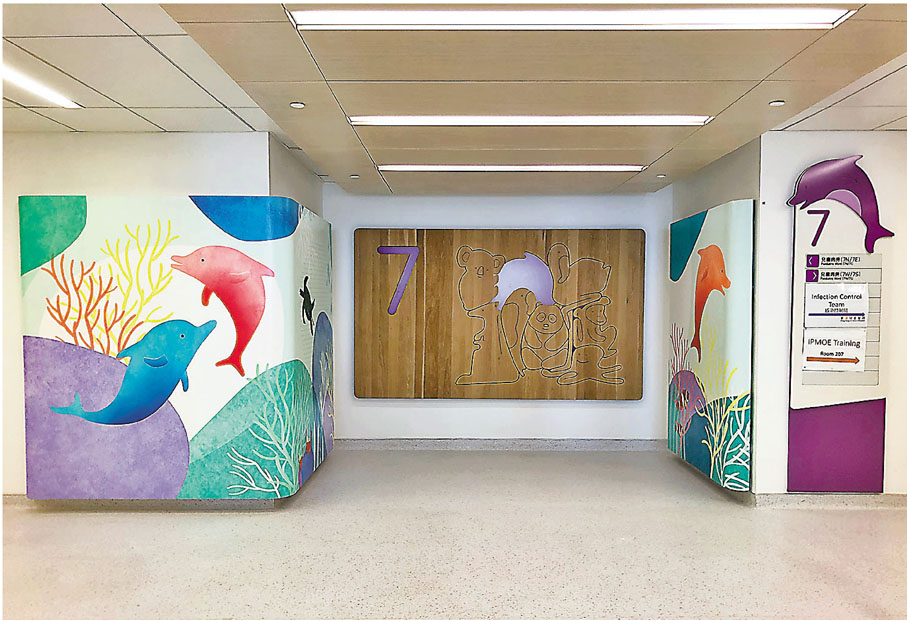 「時代精神耀香江」之大國建造民生工程走訪活動昨日到兒童醫院參觀。香港特區政府建築署署長何永賢介紹指,兒童醫院的設計除了保留香港醫院一貫着重功能性,運作上要高效率的特點外,亦加入以人為本的原則,「很多細節都是從小朋友角度出發,我們用了一套小動物圖案,每層都有不同動物主題,而且不只用於大堂等當眼位置,還包括病房和醫生的診症房。」