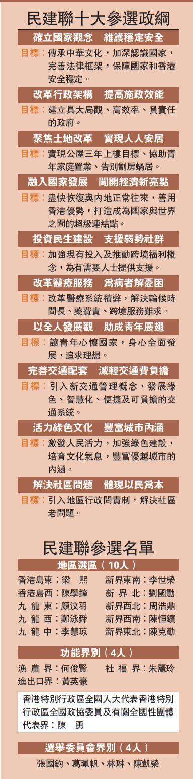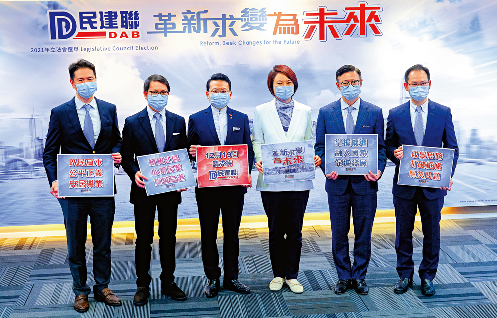 民建聯主席李慧琼表示,今次以「革新求變為未來」作為競選口號。在香港國安法和完善選舉制度下,香港由亂及治,但世界格局劇變、香港社會撕裂及疫症肆虐,令元氣大傷,深層次矛盾亦長期困擾市民。民建聯提出十大參選政綱,推動政府施政更加以民為本,實現公平正義,讓市民安居樂業。