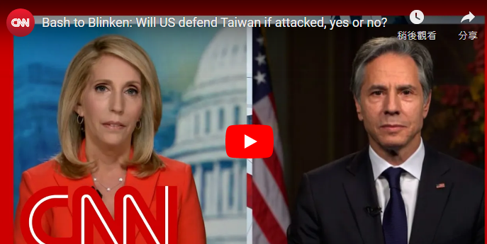 主持人巴什(Dana Bash)問布林肯,「請澄清一下,美國是否直接向台灣政府承諾,如果中國(大陸)攻擊,會直接參與防衛台灣?」