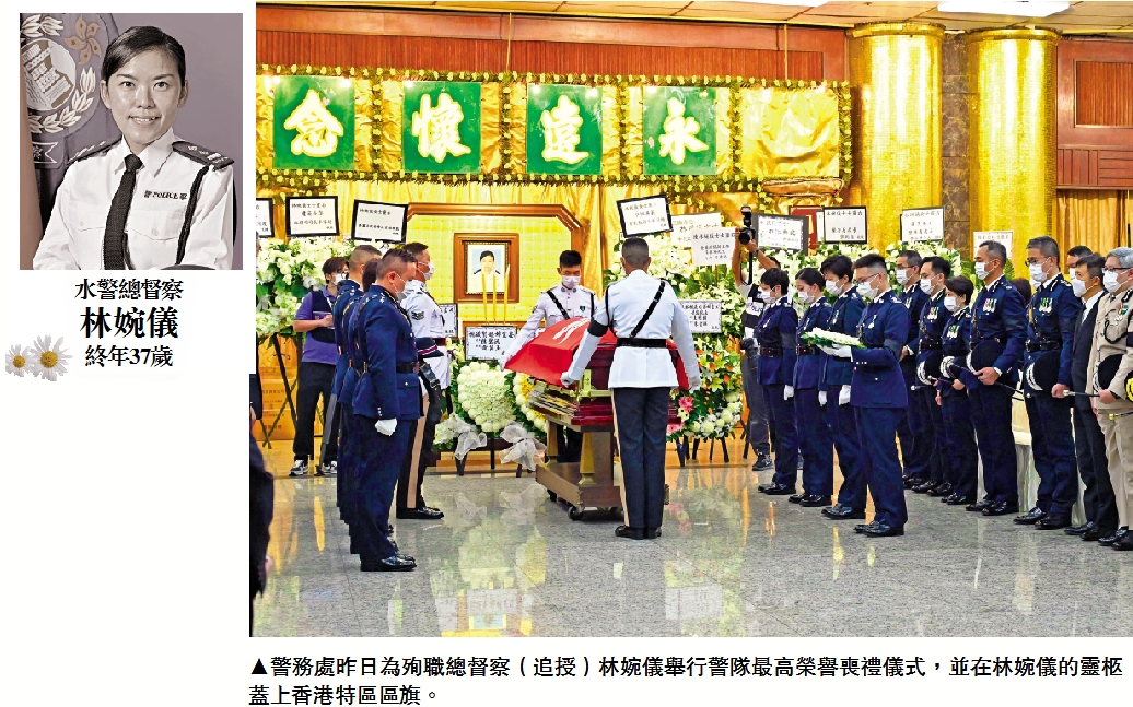 (大公報記者 黃浩輝)九月時在執行反走私期間墮海殉職的水警總督察林婉儀,昨日在紅磡世界殯儀館舉行警隊最高榮譽喪禮,靈柩安葬和合石浩園。全國政協副主席梁振英、行政長官林鄭月娥與一眾司局長、香港中聯辦、駐港解放軍代表均到靈堂送別林婉儀。警方在社交網站發帖表示沉痛哀悼,指「願那緩緩的風笛聲,隨風於雲際間,引領妳歸家,一路好走」。