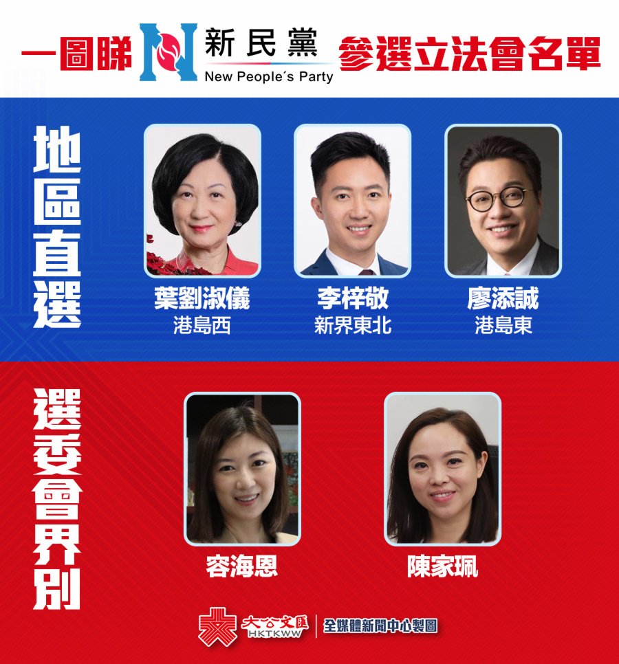大公文匯全媒體報道,立法會換屆選舉提名期由10月30日起展開,為期兩周。新民黨今日(3日)召開記者會,公布派出5人出戰立法會選舉的地區直選及選委會界別。新民黨常務副主席黎棟國表示,主席葉劉淑儀將參加港島西直選,現任議員容海恩將轉戰選委會界別。新民黨另派3人參選,包括陳家珮出戰選委會界別,李梓敬、廖添誠分別出戰新界東北及港島東直選。