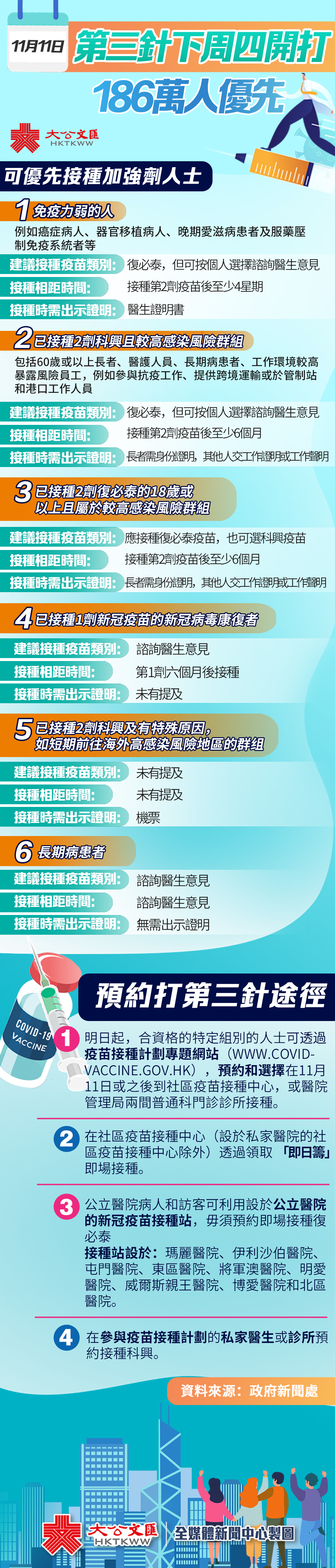 ‧本周五(5日)起可透過專題網站www.covidvaccine.gov.hk,預約到21間社區疫苗接種中心或醫管局兩間普通科門診診所接種