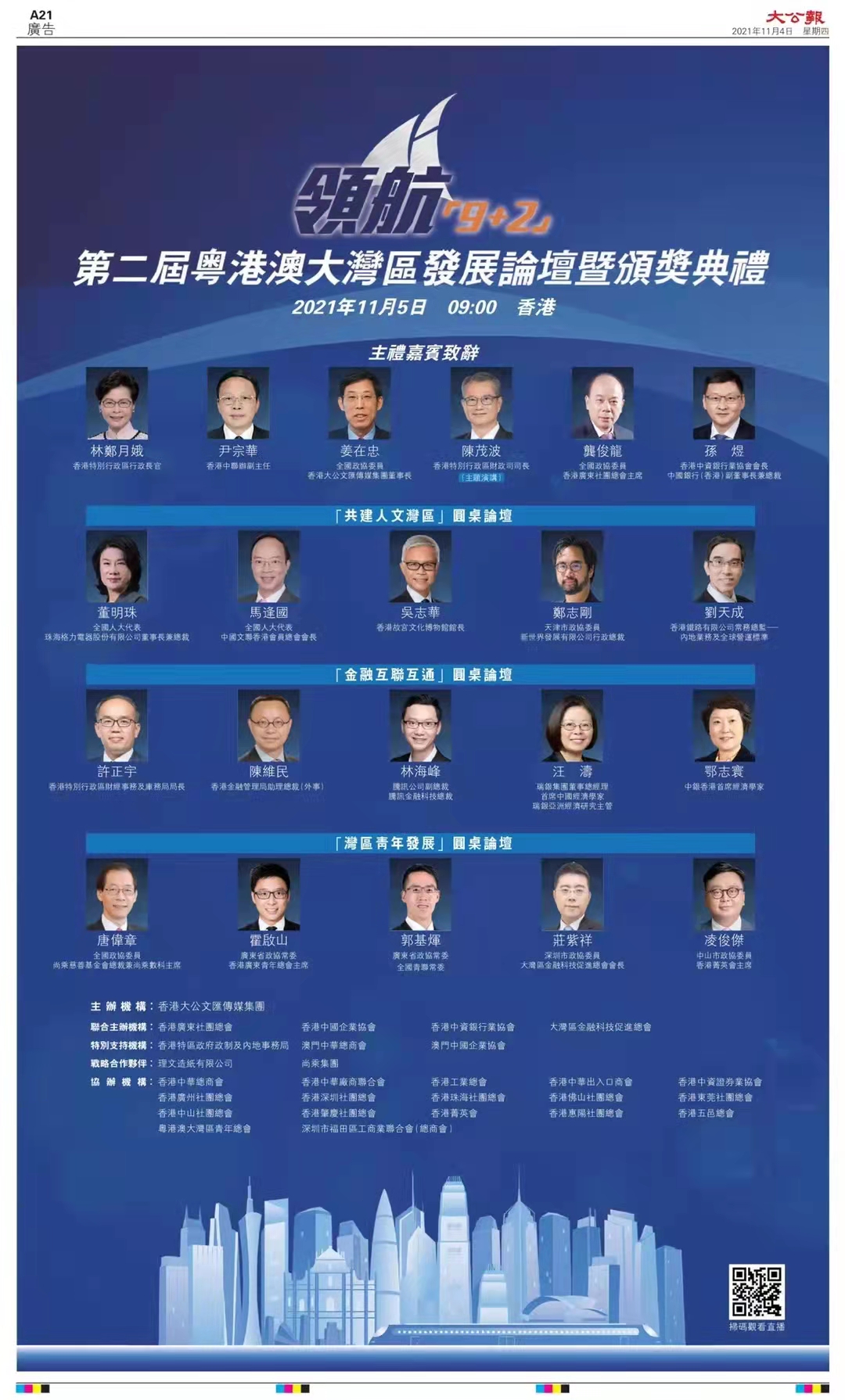 大公文匯全媒體報道,由香港大公文匯傳媒集團聯合香港廣東社團總會、香港中國企業協會、香港中資銀行業協會、大灣區金融科技促進總會共同舉辦,香港特別行政區政府政制及內地事務局、澳門中華總商會、澳門中國企業協會作為特別支持機構的「領航『9+2』·第二屆粵港澳大灣區發展論壇暨頒獎典禮」,將於明日(5日)上午9時整在香港舉行。