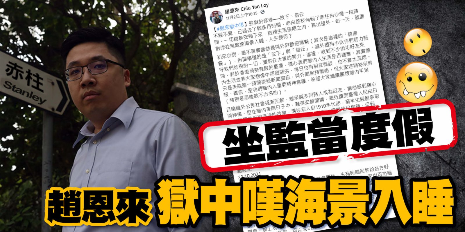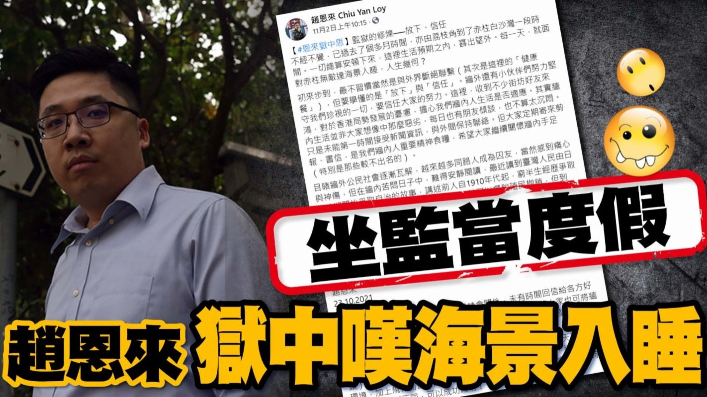 大公文匯全媒體報道:已宣布解散的反中亂港組織「支聯會」前常委、前荃灣區議員趙恩來,因被控煽惑他人參與未經批准集結,被判囚8個月,現時在白沙灣懲教所服刑。佢嘅社交平台日前上載咗獄中信,話監獄生活喺「預期之內,喜出望外。每一天,就面對赤柱無敵(達)海景入睡,人生幾何?」咁話。