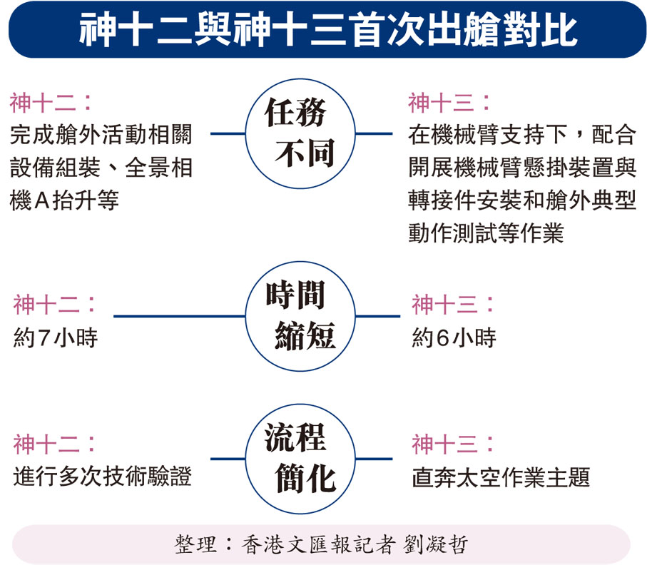 專家表示,在神舟十二號任務兩次出艙的經驗基礎上,此次出艙前期的準備流程更加精簡,也不再進行驗證性的工作,而是直奔工作點。此次的任務,是進行機械臂懸掛裝置與轉接件安裝,翟志剛站上機械臂直奔作業點,王亞平則通過攀爬達到作業點,同時葉光富在核心艙內配合支持,共同完成任務。