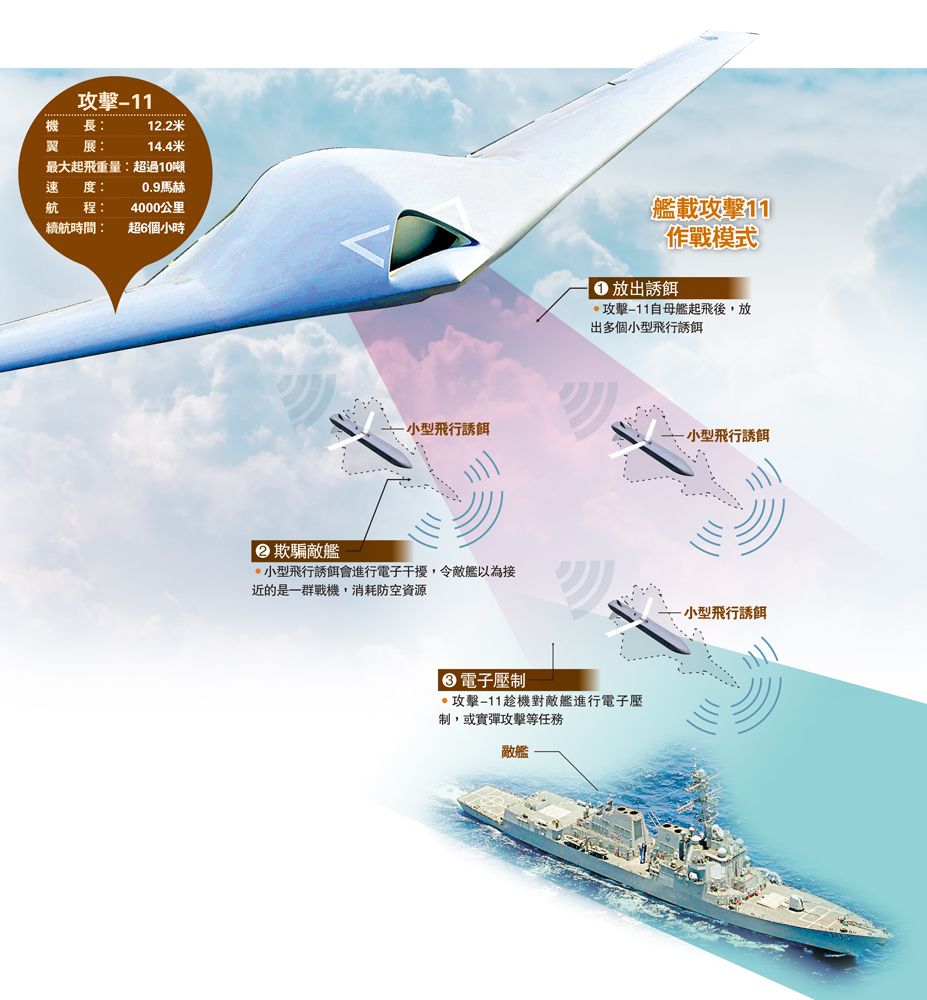 今年珠海航展,首次披露了攻擊-11的艦上起飛畫面。這款載彈量達兩噸的大型隱身攻擊無人機,經過摺疊機翼等改造後,將搭載於航空母艦、兩棲攻擊艦,既可執行單機作戰任務,亦可與殲-15「飛鯊」等有人戰機配合發動「狼群式」攻擊,執行隱身制空突擊、防空壓制、集群式飽和打擊或電子干擾等多元化任務,具備空空、空海、空地的立體化戰力,極大增強艦艇編隊的空中打擊力量。