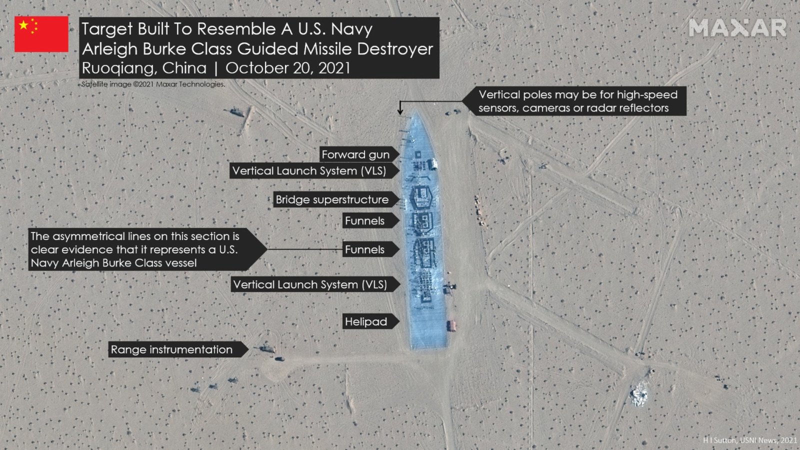 根據圖像顯示,「伯克」級驅逐艦上面有許多直立的杆子,可能是測量儀器。另外,這些杆子也可能是雷達角反射器,以模擬船舶的上部結構。對於這些模型,地理空間情報公司AllSource Analysis分析稱,這些靶標可以用於各類傳感器的目標尋獲/目標鎖定。