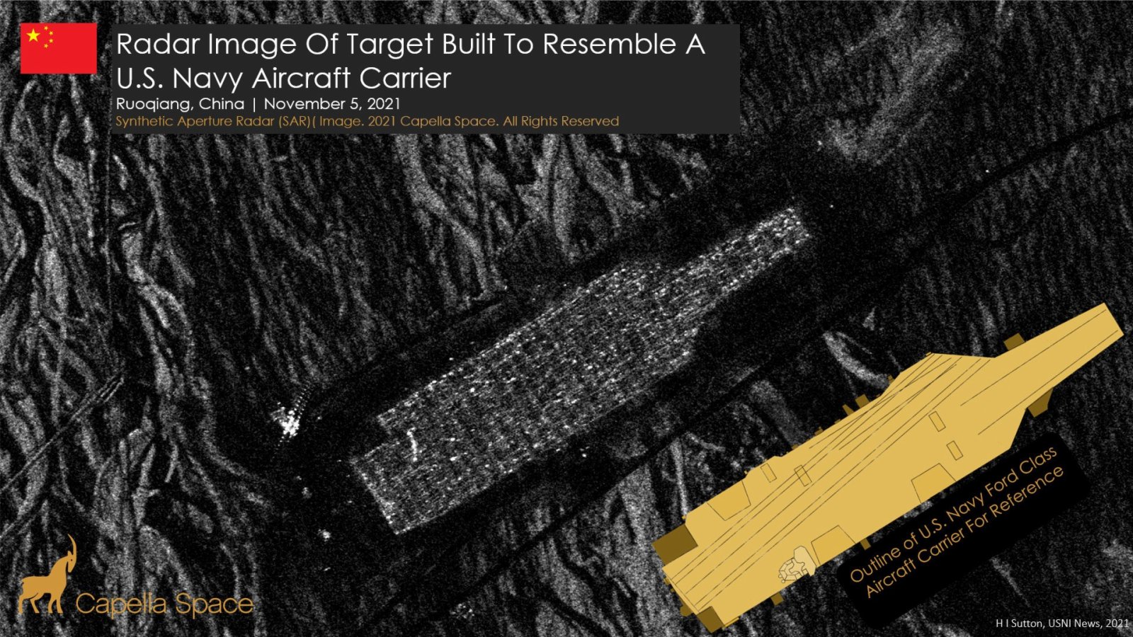 和美國海軍關係密切的美國海軍協會網站(USNI)11月8日報道稱,商業衛星公司MAXAR的衛星圖像顯示,解放軍在塔克拉瑪乾沙漠建造了一款可以「旱地行舟」的縮比機動航母靶板。