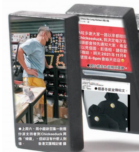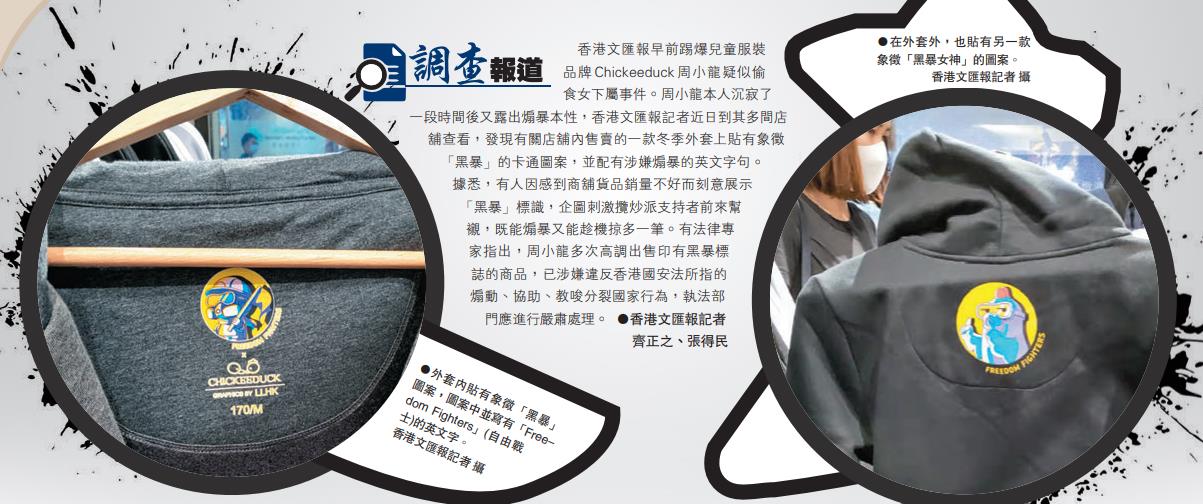 (香港文匯報記者 齊正之、張得民)香港文匯報早前踢爆兒童服裝品牌Chickeeduck周小龍疑似偷食女下屬事件。周小龍本人沉寂了一段時間後又露出煽暴本性,香港文匯報記者近日到其多間店舖查看,發現有關店舖內售賣的一款冬季外套上貼有象徵「黑暴」的卡通圖案,並配有涉嫌煽暴的英文字句。據悉,有人因感到商舖貨品銷量不好而刻意展示「黑暴」標識,企圖刺激攬炒派支持者前來幫襯,既能煽暴又能趁機掠多一筆。有法律專家指出,周小龍多次高調出售印有黑暴標誌的商品,已涉嫌違反香港國安法所指的煽動、協助、教唆分裂國家行為,執法部門應進行嚴肅處理。