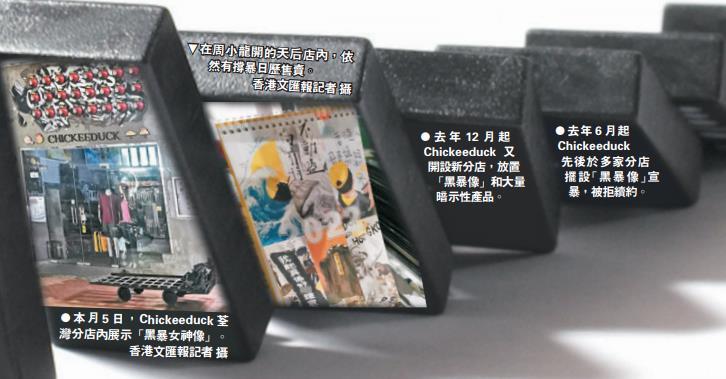 香港文匯報記者近日分別到該官網指定的荃灣及天后店舖觀察,發現店內仍有很多印有「黑暴」象徵的產品售賣,包括日曆、手機殼、襪及部分衣服等,它們大多被放置在售貨架上,而Chickeeduck社交平台專頁宣布售賣的所謂「香港加油」上衣及「黑暴」標誌的拉鏈外套,則被分別掛在兩處衣架上。前者上衣,印有所謂「香港加油」的標誌,被別在衣服胸前位置。由於該衣服為灰色,而標籤為黑色,標籤顯得格外明顯。與專頁顯示的樣板和介紹並不吻合。