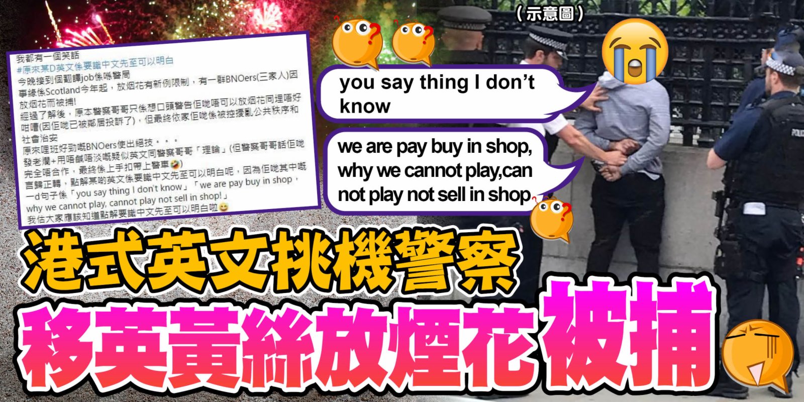 樓主話「原來某啲英文係要識中文先至可以明白」,點解呢?事緣喺蘇格蘭(Scotland)今年起,放煙花有新例限制,然而有三個BNO移民家庭違例。接到翻譯工作的樓主表示,當晚到警局了解後,發現原本警察只係想口頭警告佢哋唔可以放煙花,同埋唔好咁嘈,因為佢哋已被鄰居投訴,但呢班好勁嘅BNOers卻拒絕合作,並用「唔鹹唔淡嘅疑似英文」同警察理論,其中就有「you say thing I don’t know」、「we are pay buy in shop,why we cannot play,cannot play not sell in shop」。之唔係嗰種嗰種「隻隻字都識,不過放埋一齊就唔知佢講乜」嘅句子囉。