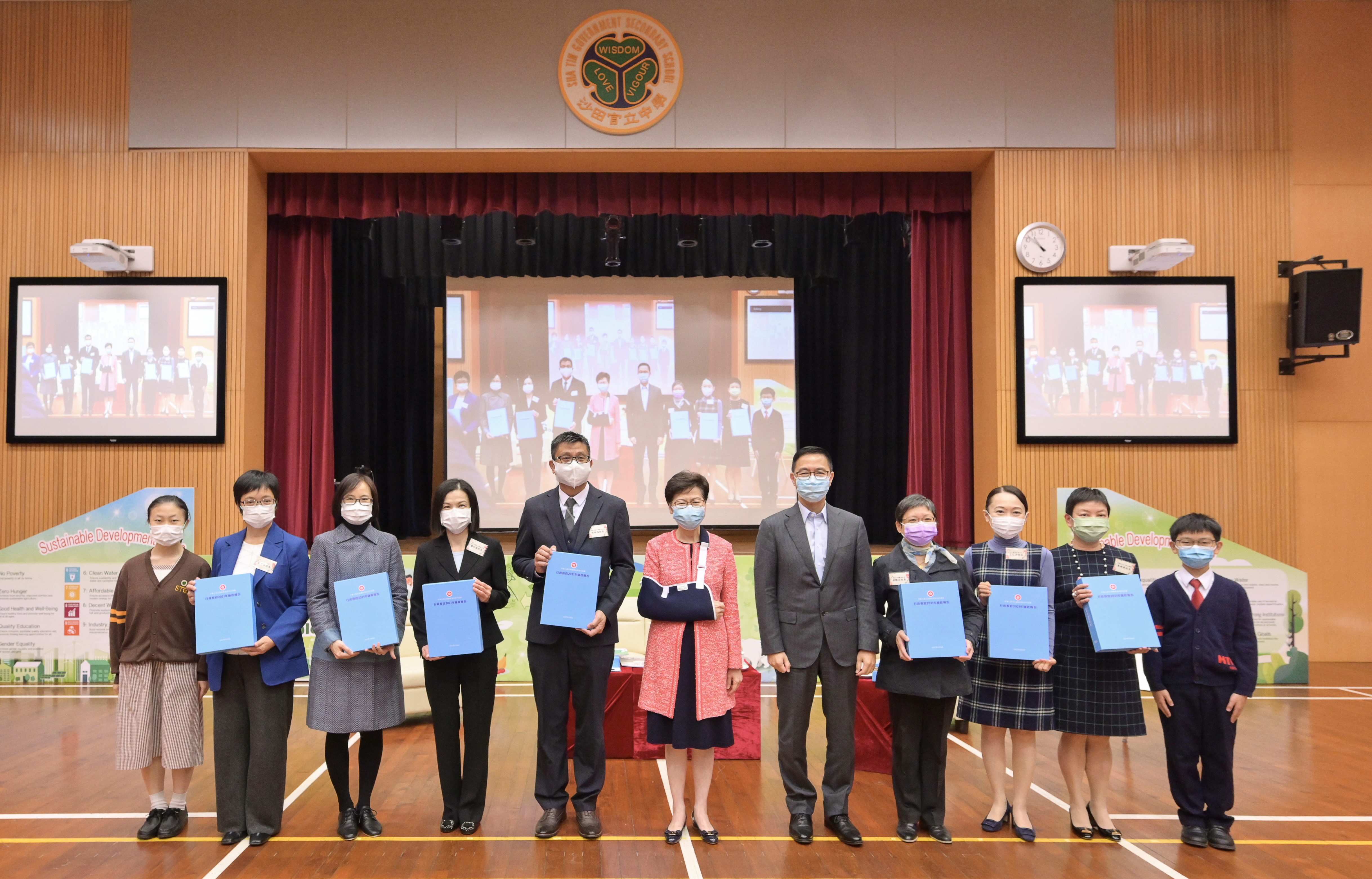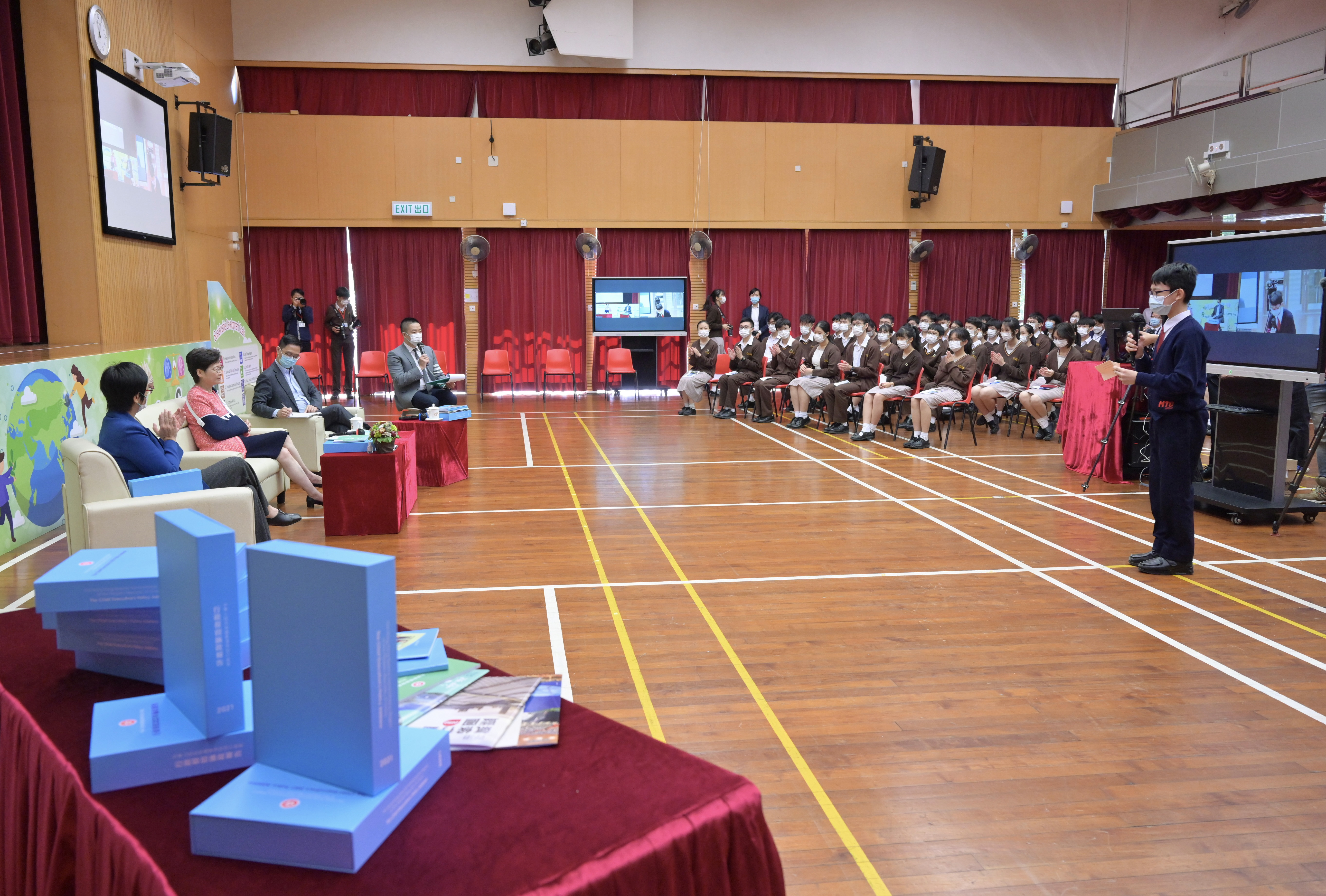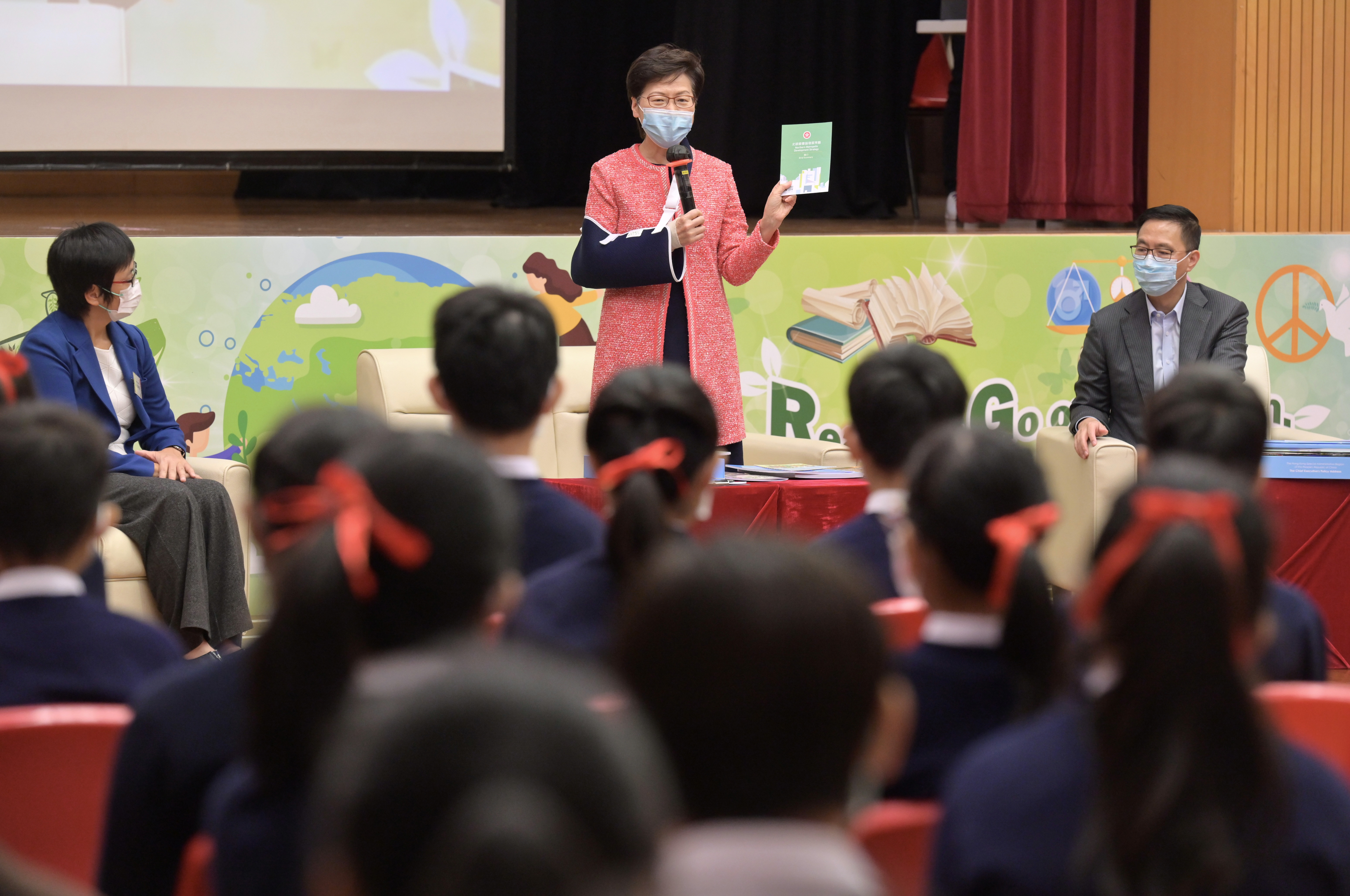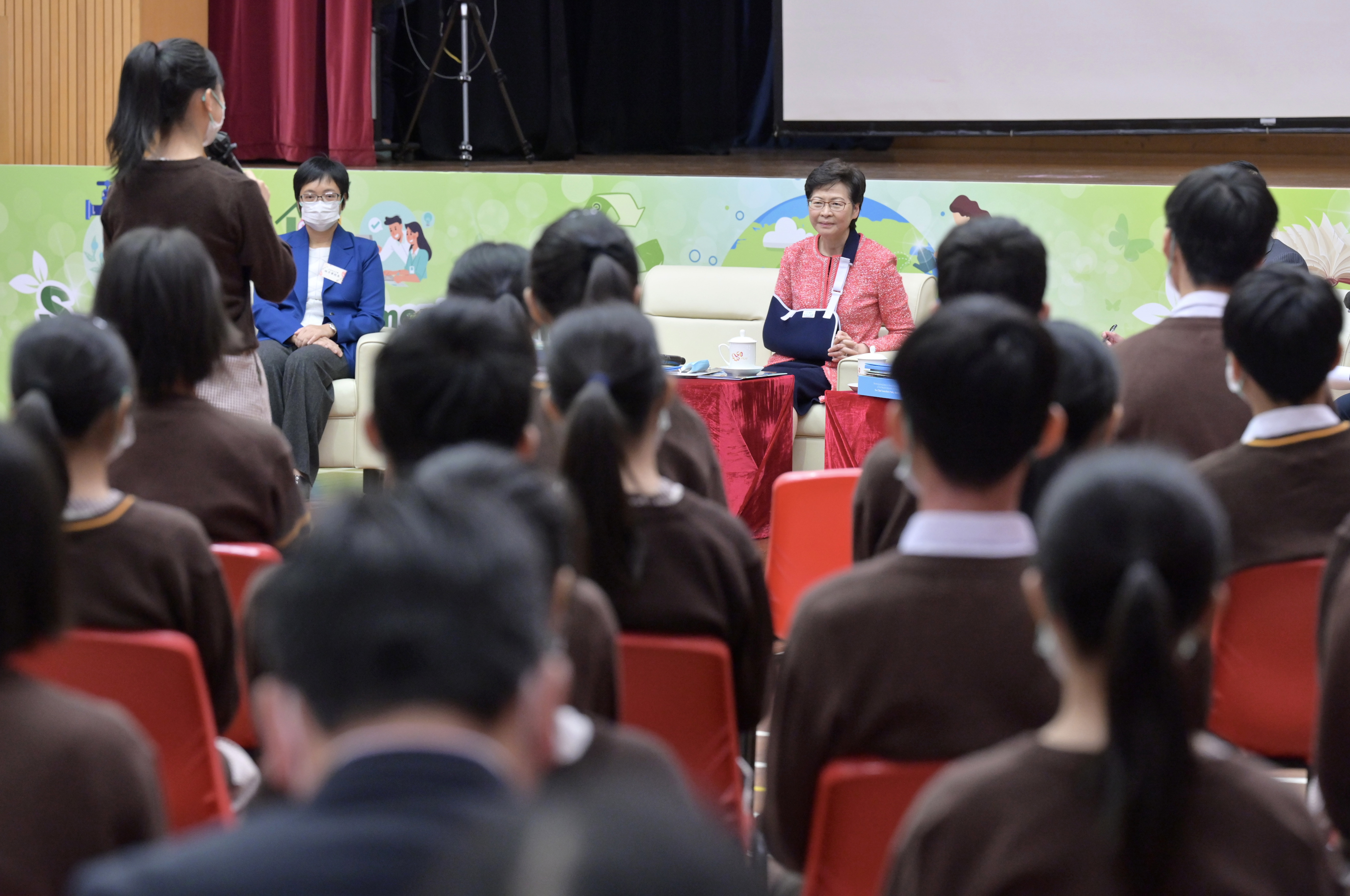 林鄭月娥在教育局局長楊潤雄和沙田官立中學校長林月華陪同下,向在場約90位來自沙田官立中學和馬頭涌官立小學(紅磡灣)的學生,及線上來自30所官立中學和五所官立小學約2000名學生介紹《2021年施政報告》的內容。在一個多小時的交流中,學生反應踴躍,共有16位學生發言,其中很多位關心北部都會區發展,其他亦提出有關土地房屋、創新科技、減碳排放、文化藝術,以至「一國兩制」、憲法和基本法教育及國家安全等範疇的意見和問題。