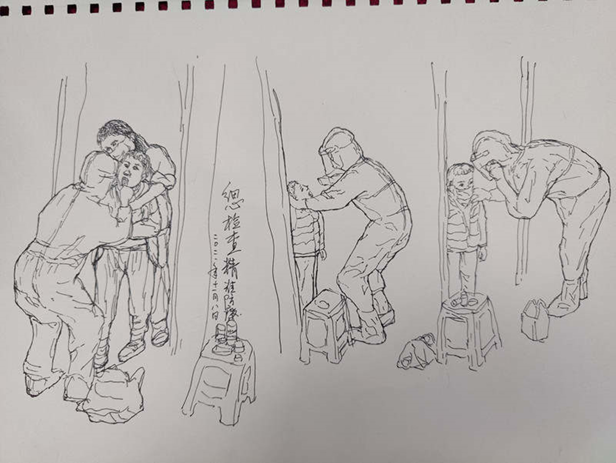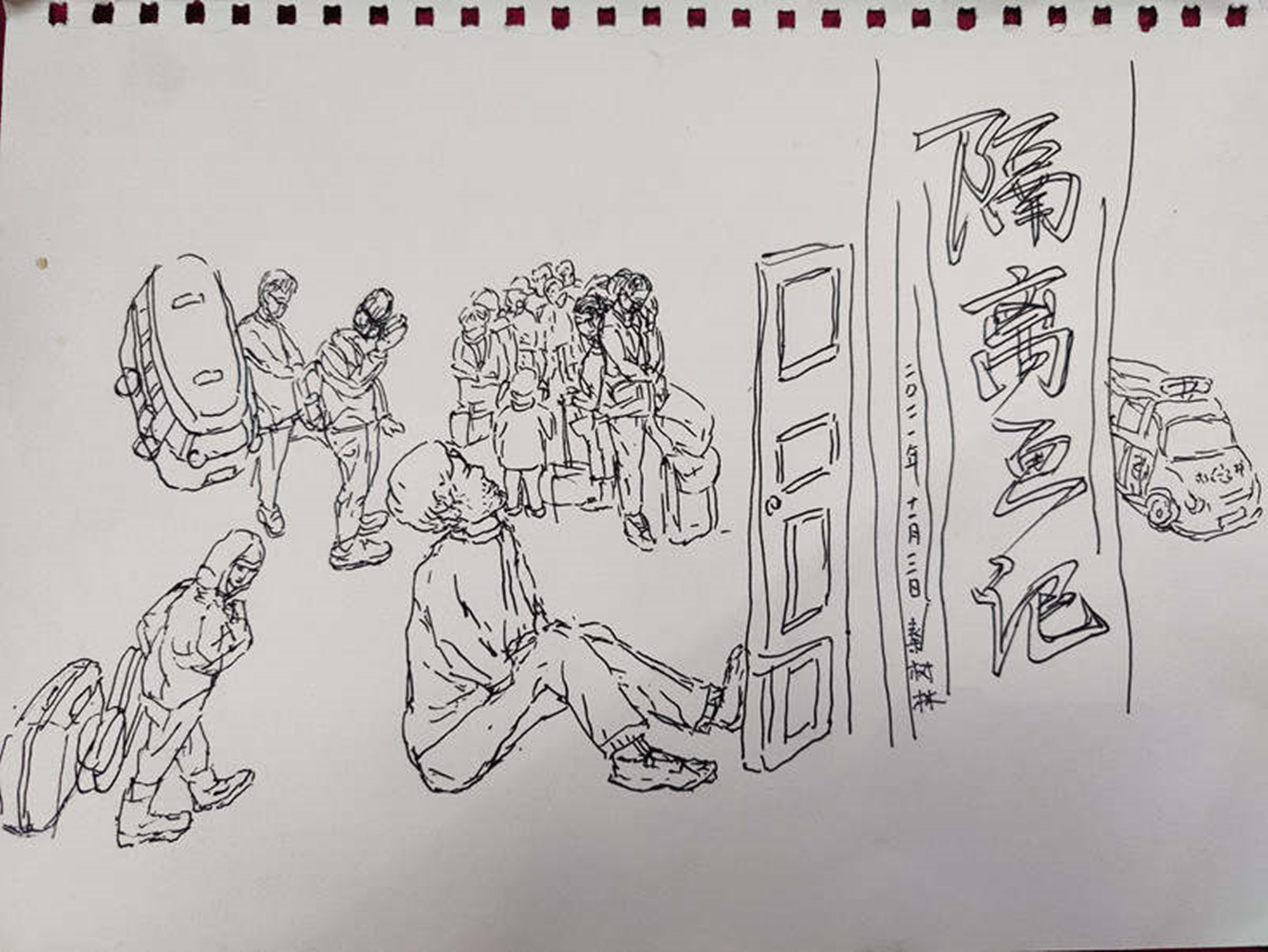 自11月3日起,54歲的秦樹林入駐隔離酒店,一日三餐均由酒店提供。「醫務人員每天穿着厚重的防護服為我們量體溫、測核酸,從早忙到晚非常辛苦,讓我很感動。」秦樹林說,作為一名親歷者有感而發,拿起畫筆記錄下了一個個「逆行者」的身影,「這些畫,主要表達一種敬意和感謝!」