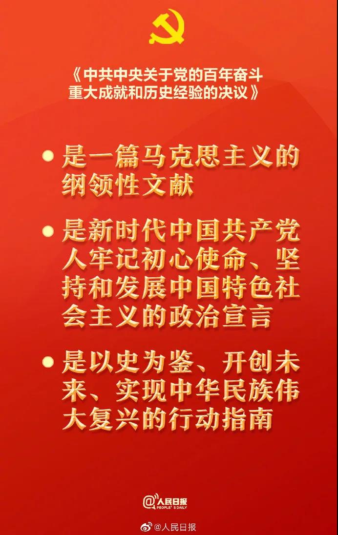 中央黨史和文獻研究院院長曲青山介紹,第一,《中共中央關於黨的百年奮鬥重大成就和歷史經驗的決議》是一篇馬克思主義的綱領性文獻;第二,《決議》是新時代中國共產黨人牢記初心使命、堅持和發展中國特色社會主義的政治宣言;第三,《決議》是以史為鑒、開創未來、實現中華民族偉大復興的行動指南。