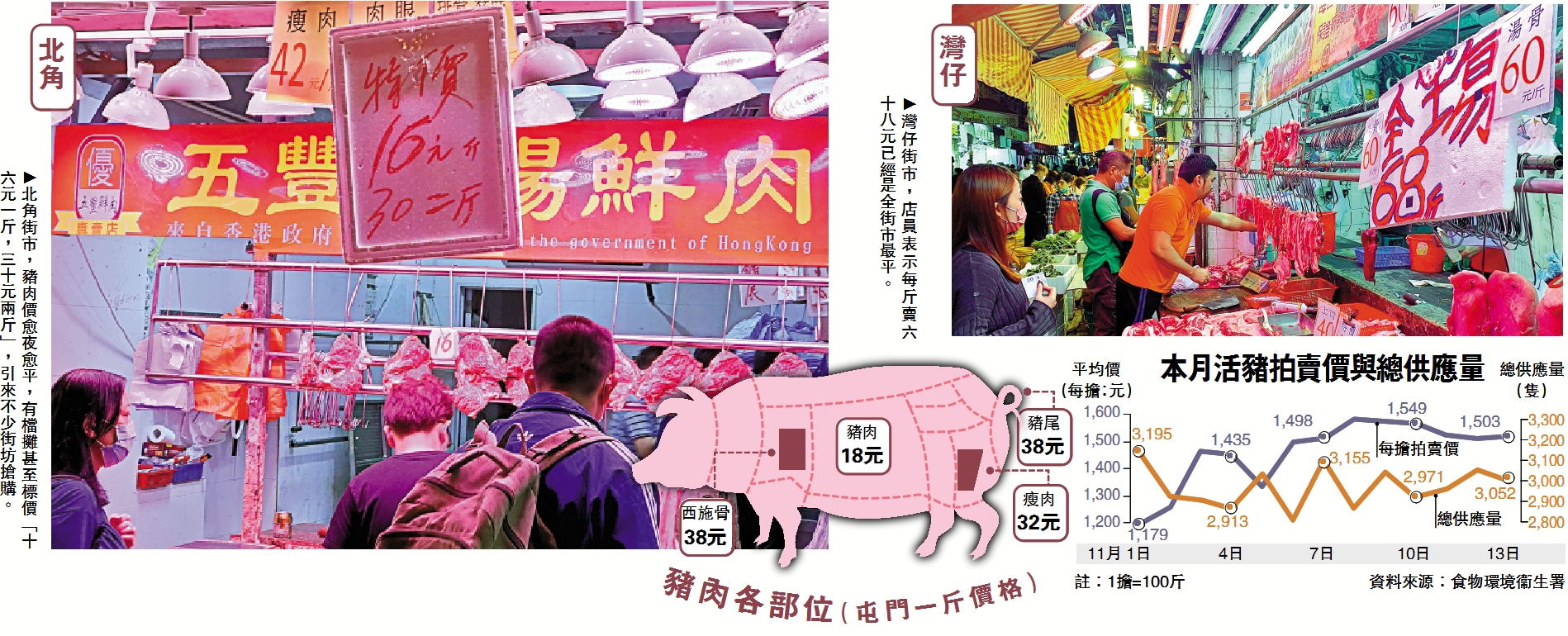 (大公報記者 伍軒沛、鄭雷、凱楊、馬丁)踏入11月,活豬拍賣價節節上升,但匪夷所思的是,近日屯門新墟戶外街市竟有多間鮮豬肉檔爆減價戰。有檔戶稱因不滿同區在半年內多了數間豬肉店開業,遂打起了「同歸於盡、血戰到底」的旗號,豬肉割價至18元一斤,瘦肉32元一斤。有元朗基層市民及長者為了「搶平肉」,特意跨區到屯門掃貨,笑言「買定幾斤實無死!成架車都喺度講豬肉,好似巴士購物團。」