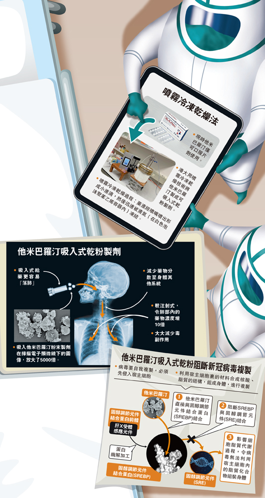 「神藥在哪裏?」人類生活被新冠疫情徹底破壞,世界各地都在爭分奪秒地研發新冠「神丹妙藥」,本港高校亦不甘落後。由香港大學李嘉誠醫學院(港大醫學院)藥理及藥劑學系及微生物學系合作組成的研究團隊發現,治療白血病藥物他米巴羅汀(tamibarotene)經肺部給藥,能針對包括新冠病毒在內的多種病毒,提供有效的抗病毒活性。但口服他米巴羅汀片劑難以到達肺部,研究團隊將該藥物製備成可吸入式乾粉製劑,而劑量相同時,吸入粉劑在肺部的藥物濃度較口服和注射方式高,療效跟現時醫治新冠肺炎的藥物瑞德西韋一樣。