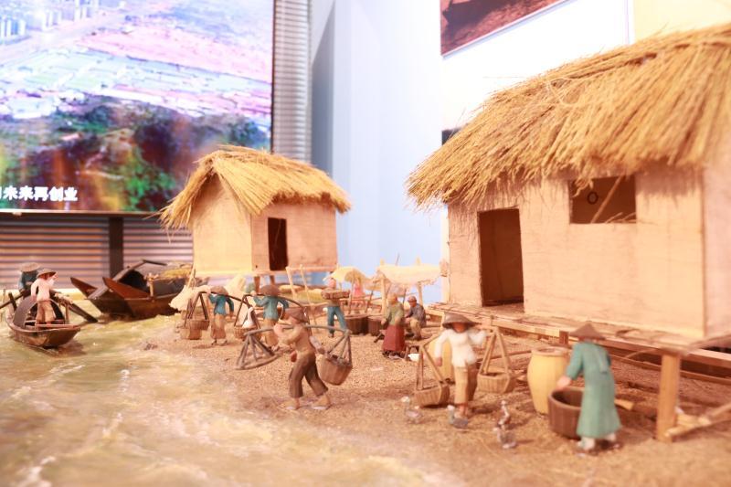 步入和平社區村史館,一幅幅基圍文化傳承圖捲伴着鹹水歌的樂聲,徐徐展開。50幅惟妙惟肖的水墨畫、中間用船木製作的桌子、重現基圍人昔日生活的沙盤以及記錄着基圍知識的文化牆,訴說着基圍文化的點點滴滴。