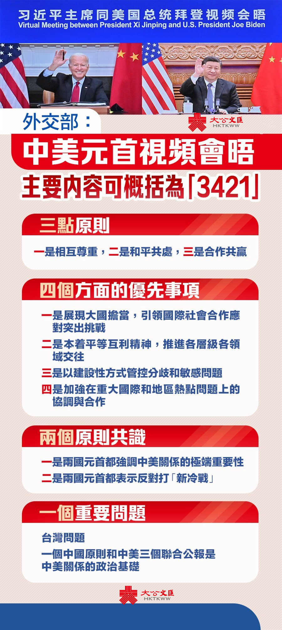 大公文匯全媒體報道,國家主席習近平今日(16日)上午同美國總統拜登舉行視頻會晤。外交部副部長謝鋒接受媒體採訪,表示這次會晤的主要內容可以概括為「3421」,也就是習近平主席就發展中美關係提出了「三點原則」和「四個方面的優先事項」,兩國領導人達成了「兩個原則共識」,習近平主席就「一個重要問題」深入做了美方工作。