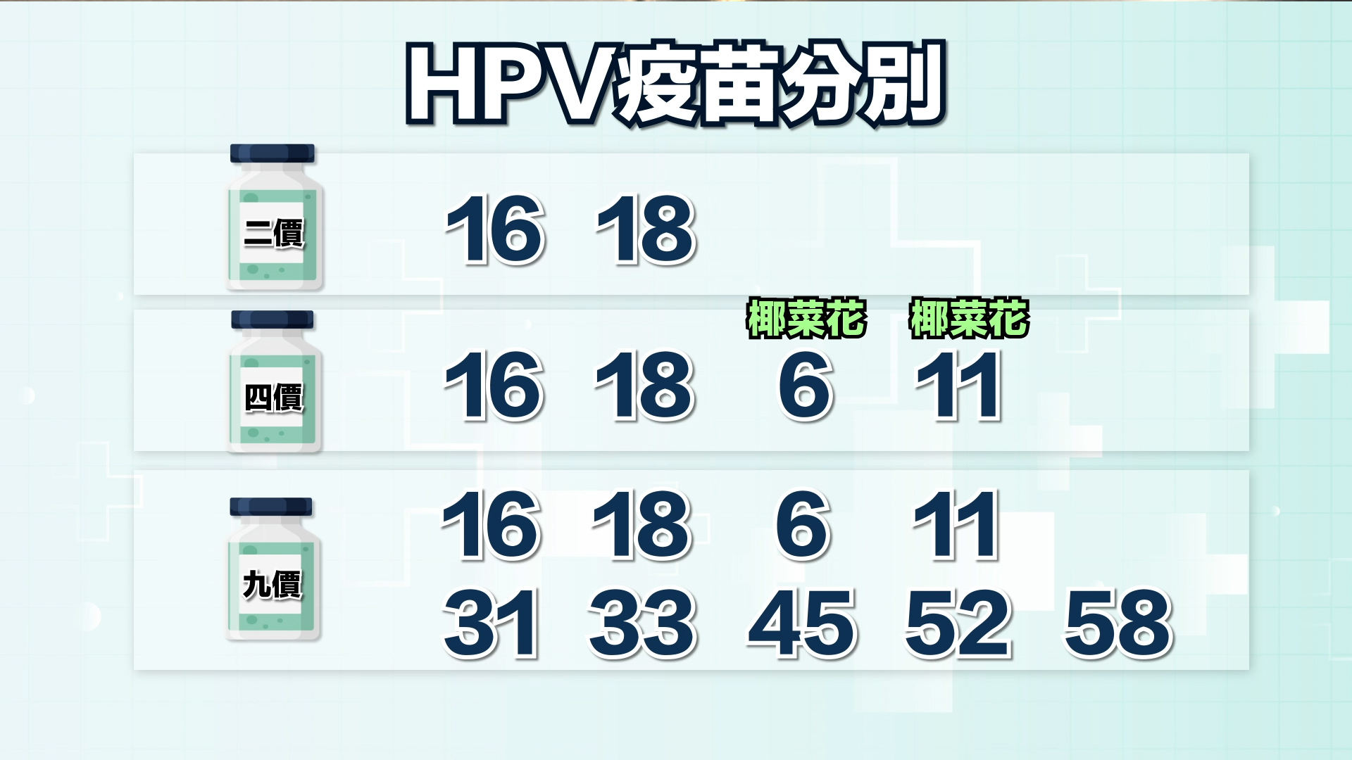 疫苗價數越高,則代表可預防的病毒類型越多。至於這3款疫苗該如何選擇,顏婉嫦解釋,「二價」和「四價」對預防子宮頸癌來講,效果是一樣的,都可以預防16型及18型。除此之外,「四價」還可以預防HPV6型和11型,即是會引起生殖器疣,也就是俗稱「椰菜花」的兩種病毒類型。而「九價」則是除「四價」之外,再多預防5個種類的非常見高危HPV病毒,接種後大約可以預防90%的子宮頸癌,保護效力最好。