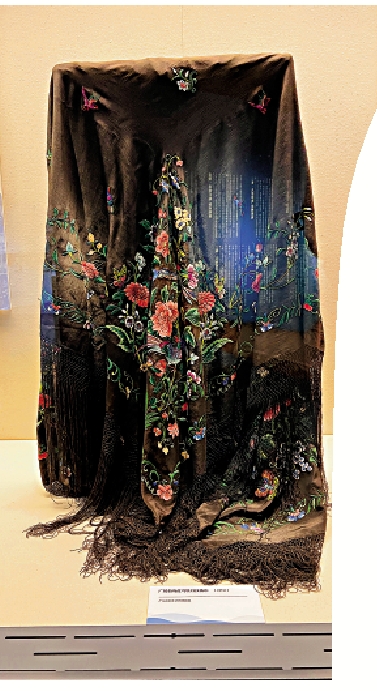 廣繡葡萄藍鳥牡丹紋披肩,正是沿着海上絲綢之路遠銷歐洲的產品。蕾絲、流蘇與黑色絲綢的搭配,即使放在今日也不過時;綠葉、紅花、藍鳥,在黑色的緞面上顯得格外艷麗;絲線層層疊疊,勾勒出花的嬌嫩和鳥的靈動。
