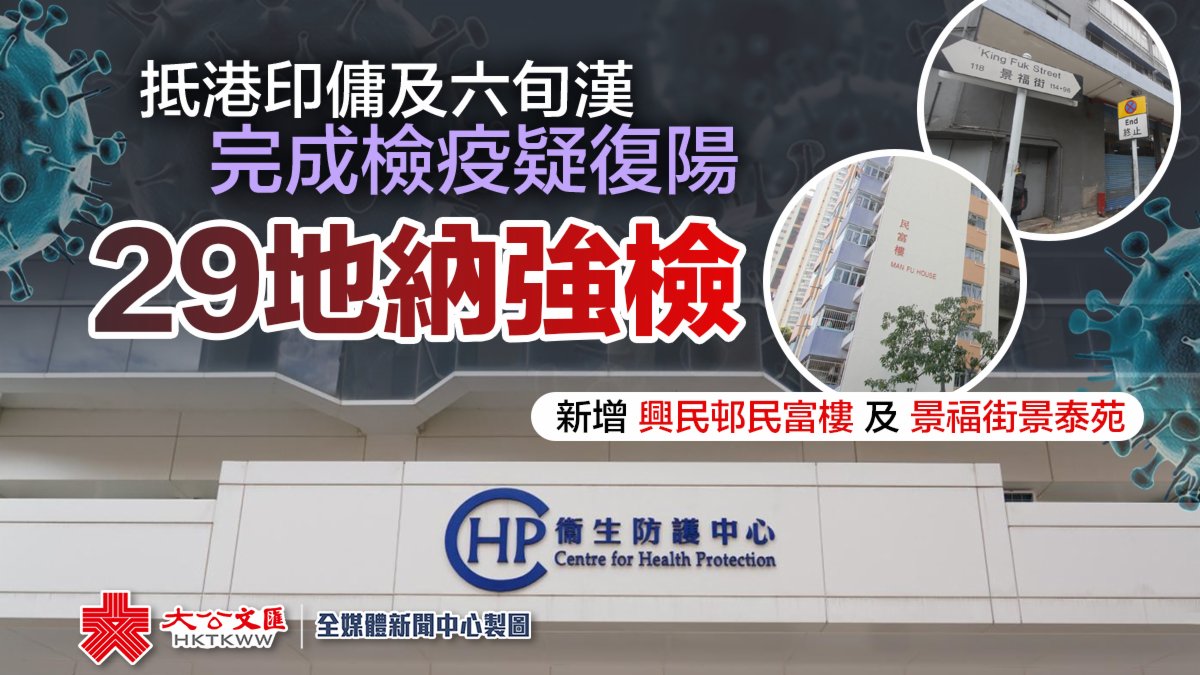 大公文匯全媒體報道,衞生防護中心正調查兩宗於潛伏期間曾於香港逗留的初步確診輸入個案。因應該兩宗個案,政府昨晚(16日)發出強制檢測公告,包括香港迪士尼樂園在內的27個指明地方要強制檢測。不過,政府今日(17日)中午修訂有關強檢公告,新增兩個指明地方被納入強制檢測公告,即合共有29個地方的指明人士要強制檢測。新增的兩個指明地方包括興民邨民富樓及景福街景泰苑。
